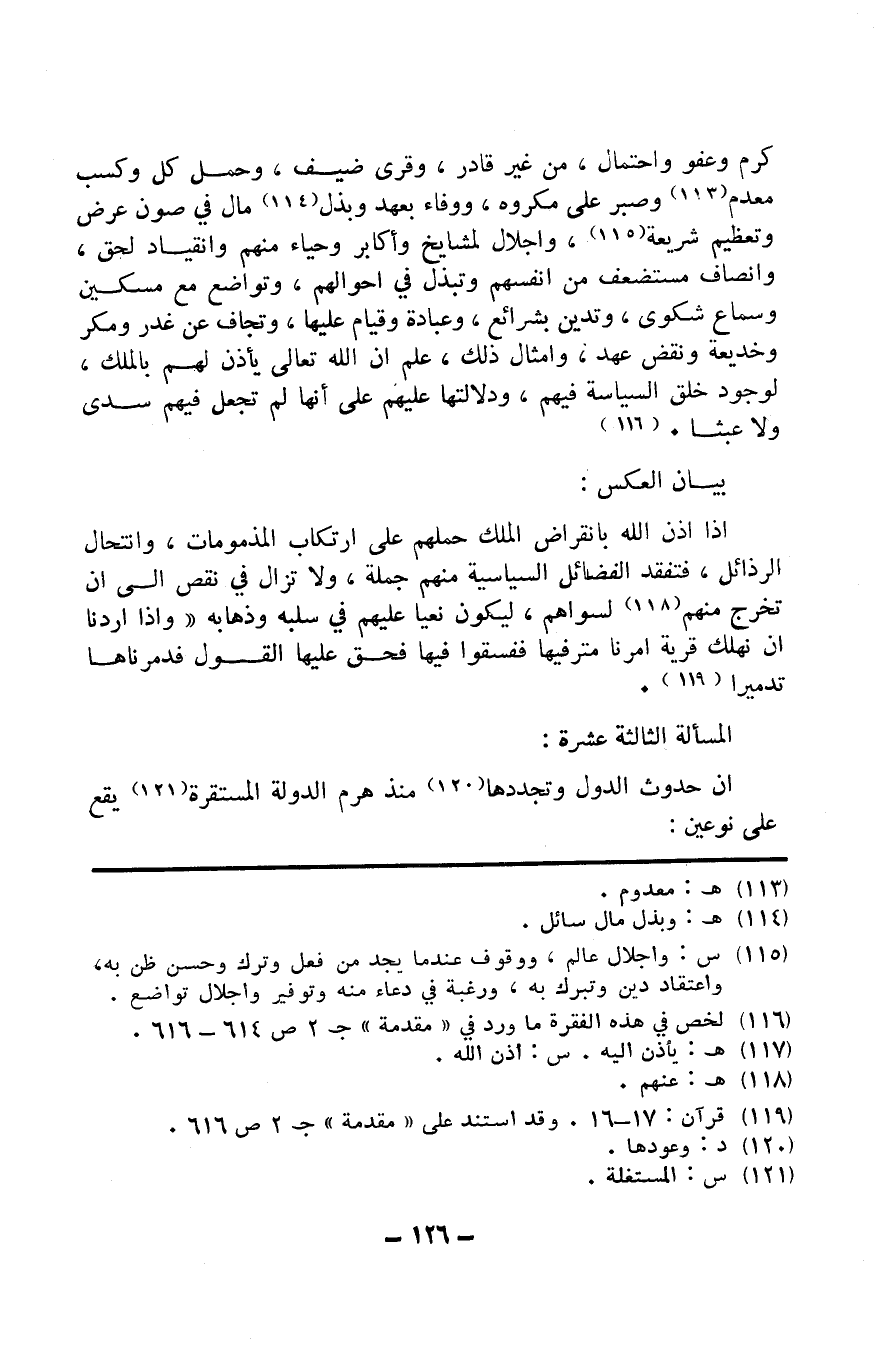 كرم وعفو وَاحْتِمَال من غير قَادر وقرى ضيف وَحمل كل وَكسب معدم وصبر على مَكْرُوه ووفاء بِعَهْد وبذل مَال فِي صون عرض وتعظيم شَرِيعَة وإجلال لمشايخ وأكابر وحياء مِنْهُم وانقياد لحق وإنصاف مستضعف من أنفسهم وتبذل فِي أَحْوَالهم وتواضع مَعَ مِسْكين وَسَمَاع شكوى وَتَدين بشرائع وَعبادَة وَقيام عَلَيْهَا وتجاف عَن غدر ومكر وخديعة وَنقض عهد وأمثال ذَلِك علم أَن الله تَعَالَى يَأْذَن لَهُم بِالْملكِ لوُجُود خلق السياسة فيهم ودلالتها عَلَيْهِم على أَنَّهَا لم تجْعَل فيهم سدى وَلَا عبثاء