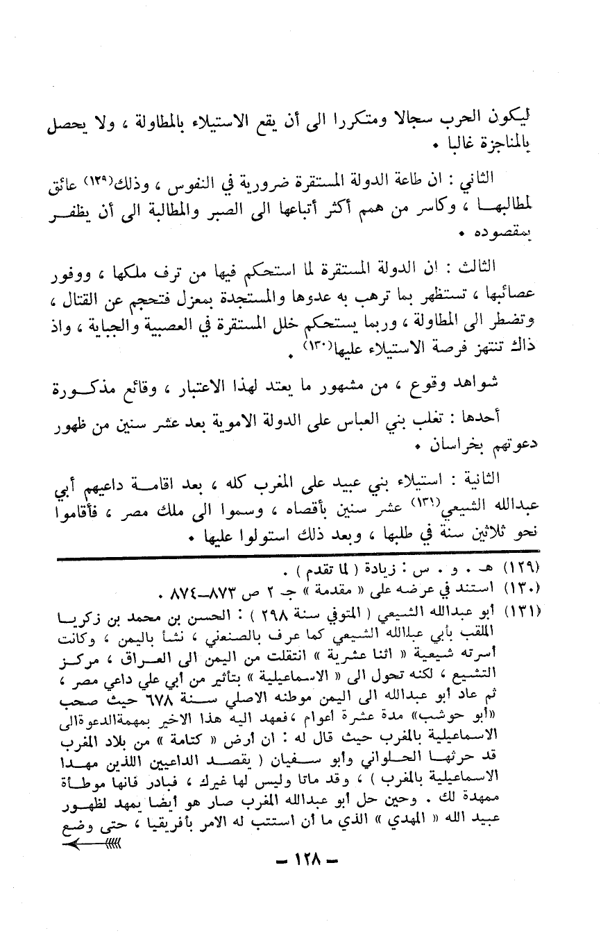 الثَّانِي إِن طَاعَة الدولة المستقرة ضَرُورِيَّة فِي النُّفُوس وَذَلِكَ عائق لمطالبها وكاسر من همم أَكثر اتباعها إِلَى الصَّبْر والمطالبة إِلَى أَن يظفر بمقصوده