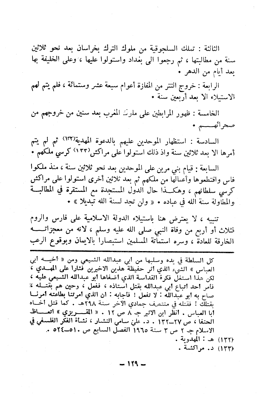 الثَّالِثَة تملك السلجوقية من مُلُوك التّرْك بخراسان بعد نَحْو ثَلَاثِينَ سنة من مطالبها ثمَّ بَغْدَاد واستولوا عَلَيْهَا وعَلى الْخَلِيفَة بهَا بعد أَيَّام من الدَّهْر