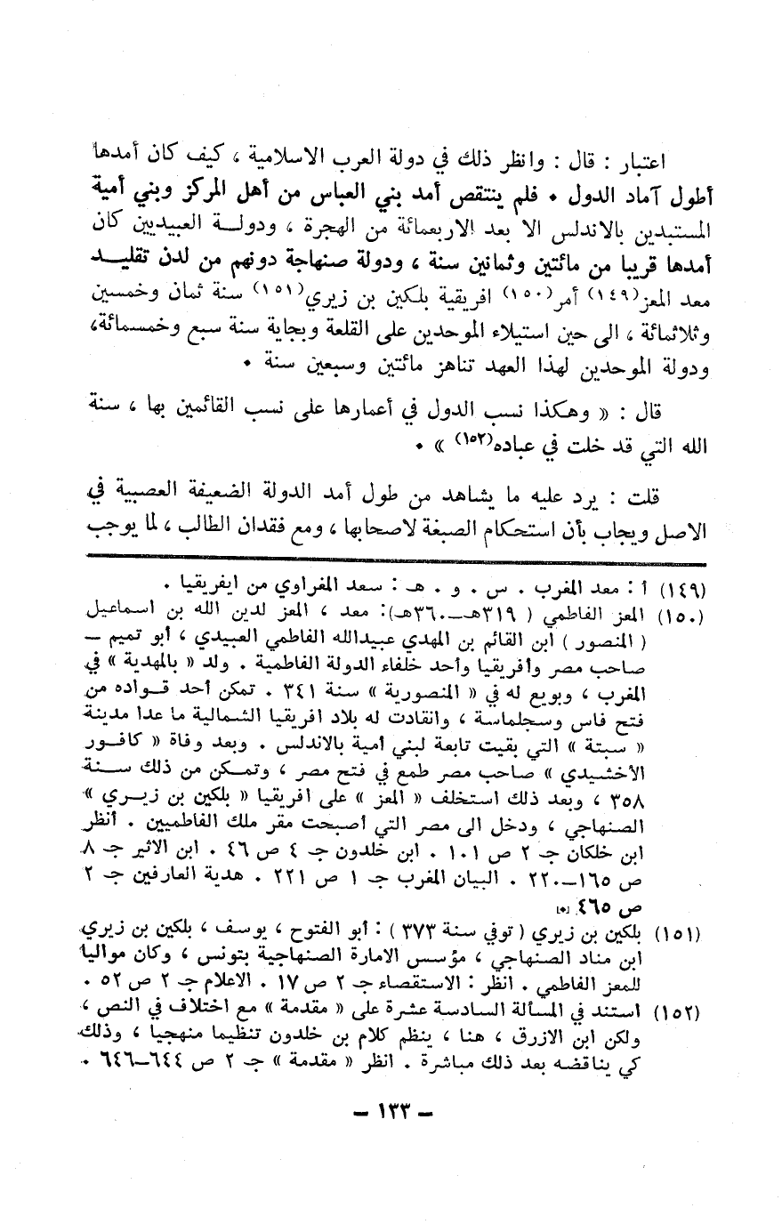 اعْتِبَار قَالَ وَانْظُر ذَلِك فِي دولة الْعَرَب الإسلامية كَيفَ كَانَ أمدها أطول آماد الدول فَلم ينتقص أمد بني الْعَبَّاس من أهل المركز وَبني أُميَّة المستبدين بالأندلس إِلَّا بعد الأربعمائة من الْهِجْرَة ودولة العبيديين كَانَ أمدها قَرِيبا من مِائَتَيْنِ وَثَمَانِينَ سنة ودولة صنهاجة دونهم من لدن تَقْلِيد معد الْمعز أَمر إفريقية بلكين بن زيري سنة ثَمَان وَخمسين وثلاثمائة إِلَى حِين اسْتِيلَاء الْمُوَحِّدين على القلعة وبجاية سنة سبع وَخَمْسمِائة ودولة الْمُوَحِّدين لهَذَا الْعَهْد تناهز مِائَتَيْنِ وَسبعين سنة