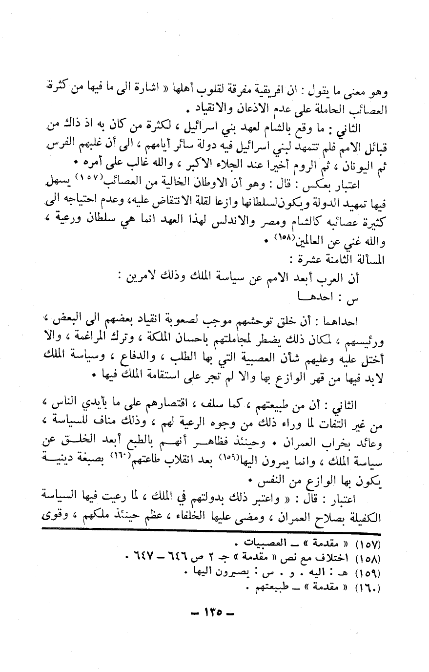 اعْتِبَار بعكس قَالَ وَهُوَ أَن الأوطان الخالية من العصائب يسهل فِيهَا تمهيد الدولة وَيكون لسلطانها وازعا لقلَّة الانتقاض عَلَيْهِ وَعدم احْتِيَاجه إِلَى كَثِيرَة عصائبه كالشام ومصر والأندلس لهَذَا الْعَهْد إِنَّمَا هِيَ سُلْطَان ورعية وَالله غَنِي عَن الْعَالمين