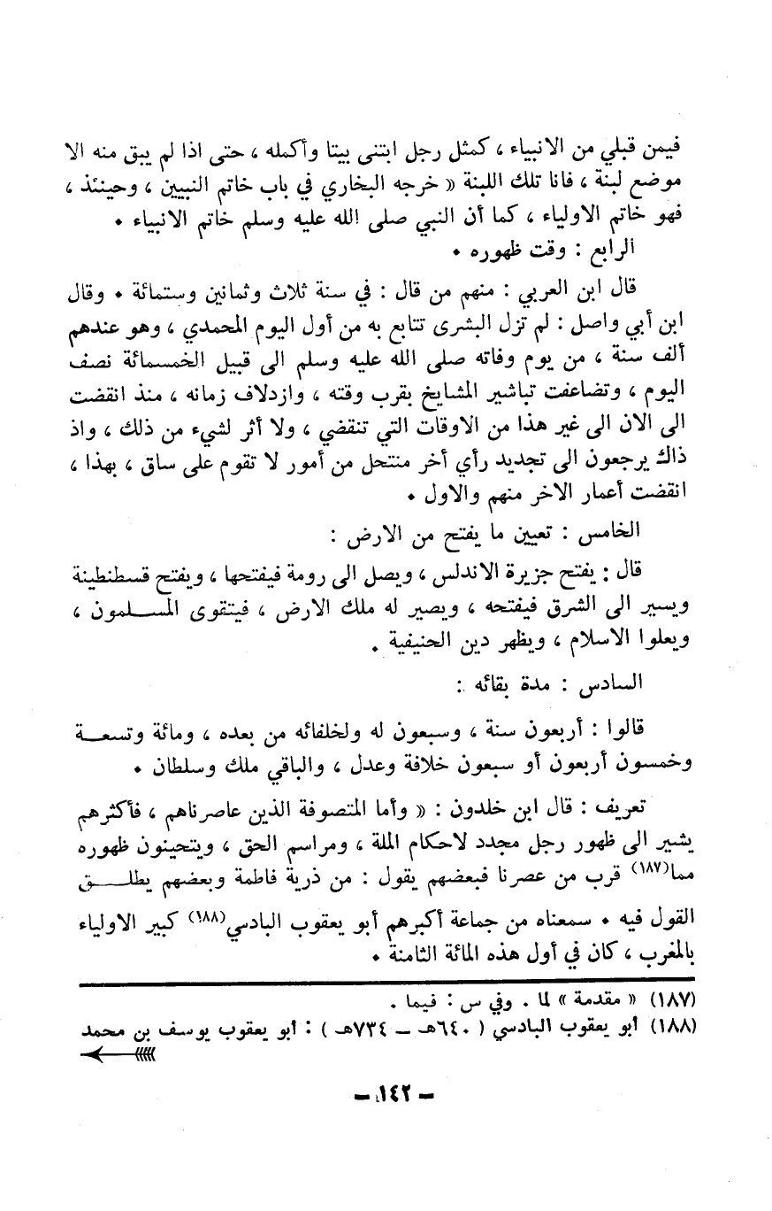 تَعْرِيف قَالَ ابْن خلدون وَأما المتصوفة الَّذين عاصرناهم فأكثرهم يُشِير إِلَى ظُهُور رجل مُجَدد لأحكام الْملَّة ومراسم الْحق ويتحينون ظُهُوره مِمَّا قرب من عصرنا فبعضهم يَقُول من ذُرِّيَّة فَاطِمَة وَبَعْضهمْ يُطلق القَوْل فِيهِ سمعناه من جمَاعَة أكبرهم أَبُو يَعْقُوب البادسي كَبِير الْأَوْلِيَاء بالمغرب كَانَ فِي أول هَذِه الْمِائَة الثَّامِنَة
