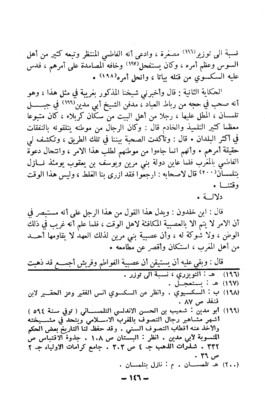 الْحِكَايَة الثَّانِيَة قَالَ وَأخْبرنَا شَيخنَا الْمَذْكُور بغريبة فِي مثل هَذَا وَهُوَ أَنه صحب فِي حجه من رِبَاط الْعباد مدفن الشَّيْخ أبي مَدين فِي جبل تلمسان المطل عَلَيْهَا رجلا من أهل الْبَيْت من سكان كربلاء كَانَ متبوعا مُعظما كثير التلميذ وَالْخَادِم قَالَ وَكَانَ الرجل من موطنه يتلقونه بالنفقات فِي أَكثر الْبلدَانِ قَالَ وتأكدت الصُّحْبَة بَيْننَا فِي تِلْكَ الطَّرِيق وتكشفت لي حَقِيقَة أَمرهم وَأَنَّهُمْ إِنَّمَا جَاءُوا من موطنهم لطلب هَذَا الْأَمر وانتحال دَعْوَة الفاطمي بالمغرب فَلَمَّا عاين دولة بني مرين ويوسف بن يَعْقُوب يَوْمئِذٍ نَازل بتلمسان قَالَ لأَصْحَابه ارْجعُوا فقد أزرى بِنَا الْغَلَط وَلَيْسَ هَذَا الْوَقْت وقتنا