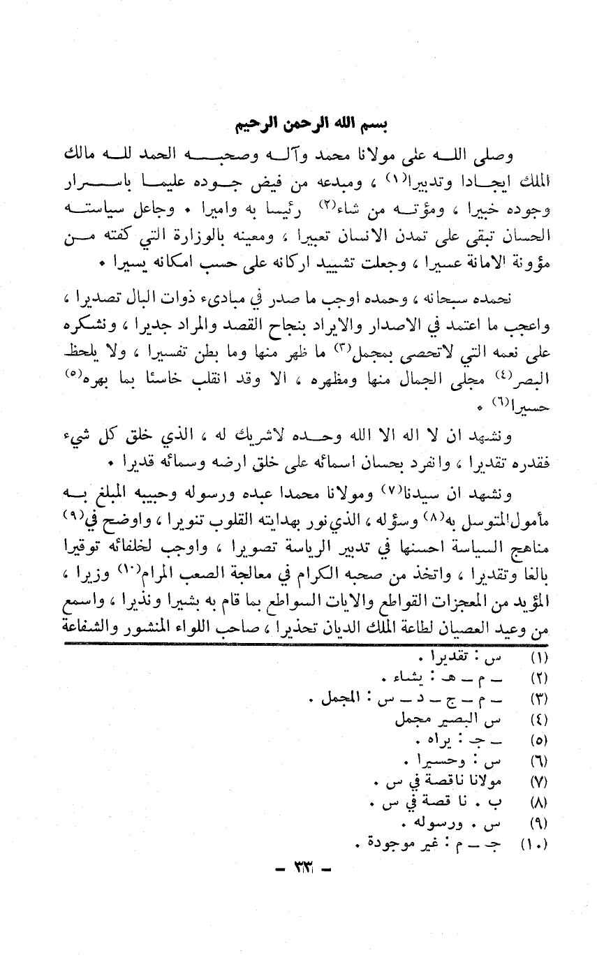 ونشهد أَن سيدنَا ومولانا مُحَمَّدًا عَبده وَرَسُوله الْمبلغ بِهِ مأمول المتوسل بِهِ وسؤله الَّذِي نور بهدايته الْقُلُوب تنويرا وأوضح فِي مَنْهَج السياسة أحْسنهَا فِي تَدْبِير الرياسة تصويرا وَأوجب لخلفائه توقيرا بَالغا وتقديرا وَاتخذ من صَحبه الْكِرَام فِي معالجة الصعب المرام وزيرا الْمُؤَيد من المعجزات القواطع والآيات السواطع بِمَا قَامَ بِهِ بشيرا وَنَذِيرا وأسمع من وَعِيد الْعِصْيَان لطاعة الْملك الديَّان تحذيرا صَاحب اللِّوَاء المنشور والشفاعة