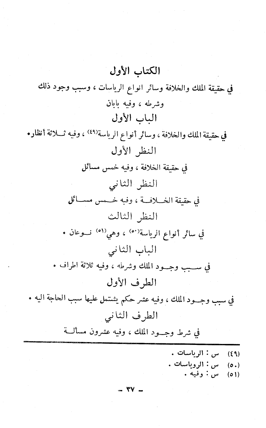 فِي حَقِيقَة الْملك والخلافة وَسَائِر أَنْوَاع الرياسة وَفِيه ثَلَاثَة أنظار