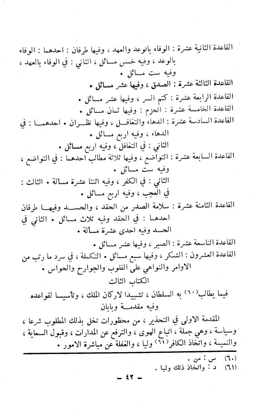 الْقَاعِدَة الثَّانِيَة عشرَة الْوَفَاء بالوعد والعهد وفيهَا طرفان أَحدهمَا الْوَفَاء بالوعد وَفِيه خمس مسَائِل الثَّانِي فِي الْوَفَاء بالعهد وَفِيه سِتّ مسَائِل الْقَاعِدَة الثَّالِثَة عشرَة الصدْق وفيهَا عشر مسَائِل الْقَاعِدَة الرَّابِعَة عشرَة كتم السِّرّ وفيهَا عشر مسَائِل الْقَاعِدَة الْخَامِسَة عشرَة الحزم وفيهَا ثَمَان مسَائِل الْقَاعِدَة السَّادِسَة عشرَة الدهاء والتغافل وفيهَا نظران أَحدهمَا الدهاء وَفِيه أَربع مسَائِل الثَّانِي فِي التغافل وَفِيه أَربع مسَائِل الْقَاعِدَة السَّابِعَة عشرَة التَّوَاضُع وفيهَا ثَلَاثَة مطَالب أَحدهمَا فِي التَّوَاضُع وَفِيه سِتّ مسَائِل الثَّانِي فِي الْكفْر وَفِيه اثْنَتَا عشرَة مَسْأَلَة الثَّالِث فِي الْعجب وَفِيه أَربع مسَائِل الْقَاعِدَة الثَّامِنَة عشرَة سَلامَة الصَّدْر من الحقد والحسد وفيهَا طرفان أَحدهمَا فِي الحقد وَفِيه ثَلَاث مسَائِل الثَّانِي فِي الْحَسَد وَفِيه إِحْدَى عشرَة مَسْأَلَة الْقَاعِدَة التَّاسِعَة عشرَة الصَّبْر وفيهَا عشر مسَائِل الْقَاعِدَة الْعشْرُونَ الشُّكْر وفيهَا سبع مسَائِل التكملة فِي سرد مَا رتب من الْأَوَامِر والنواهي على الْقُلُوب والجوارح والحواس