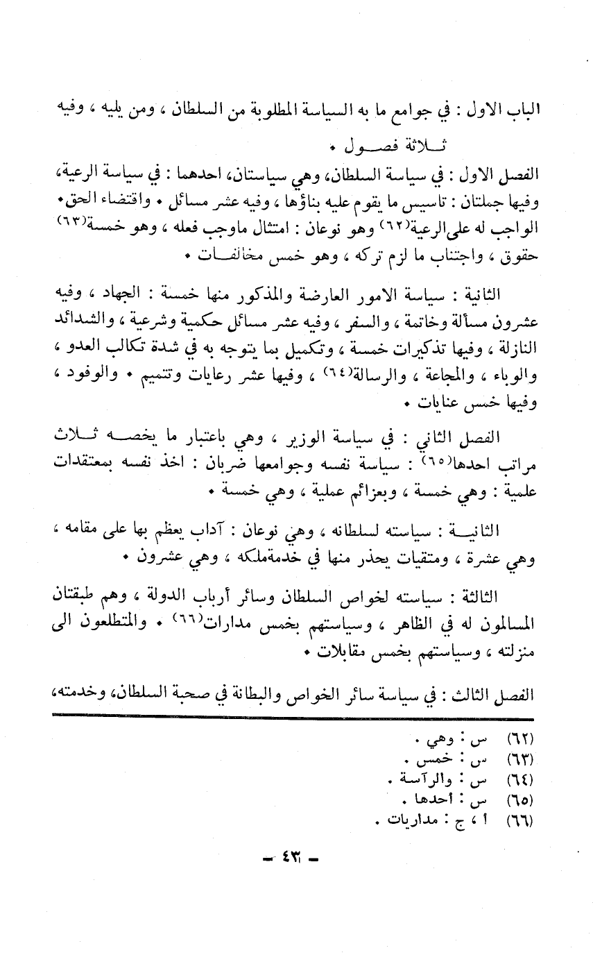 الْفَصْل الأول فِي سياسة السُّلْطَان وَهِي سياستان أَحدهمَا فِي سياسة الرّعية وفيهَا جملتان تأسيس مَا يقوم عَلَيْهِ بناؤها وَفِيه عشر مسَائِل واقتضاء الْحق الْوَاجِب لَهُ على الرّعية وَهُوَ نَوْعَانِ امْتِثَال مَا وَجب فعله وَهُوَ خَمْسَة حُقُوق وَاجْتنَاب مَا لزم تَركه وَهُوَ خمس مخالفات