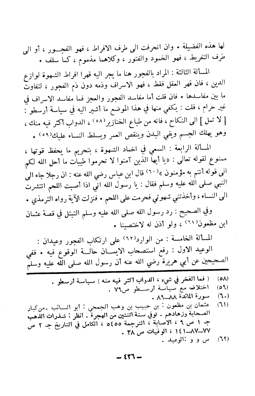 الْمَسْأَلَة الثَّالِثَة المُرَاد بِالْفُجُورِ هُنَا مَا يجر إِلَيْهِ قهرا إفراط الشَّهْوَة لوازع الدّين فَإِن قهر الْعقل فَقَط فَهُوَ الْإِسْرَاف وَذمَّة دون ذمّ الْفُجُور لتَفَاوت مَا بَين مفاسدها فَإِن قلت أما مفاسد الْفُجُور وَالْعجز فَمَا مفاسد الْإِسْرَاف فِي غير حرَام قلت يَكْفِي مِنْهَا فِي هَذَا الْموضع مَا أُشير إِلَيْهِ فِي سياسة أرسطو لَا تمل إِلَى النِّكَاح فَإِنَّهُ من طباع الْخَنَازِير الدَّوَابّ أَكثر فِيهِ مِنْك وَهُوَ يهْلك الْجِسْم ويقي الْبدن وَينْقص الْعُمر ويسلط النِّسَاء عَلَيْك