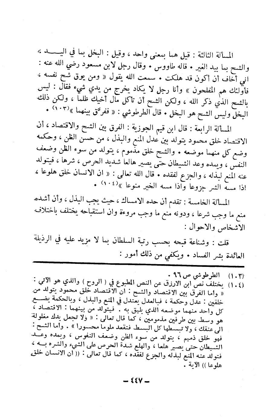 الْمَسْأَلَة الرَّابِعَة قَالَ ابْن قيم الجوزية الْفرق بَين الشُّح والاقتصاد أَن الاقتصاد خلق مَحْمُود يتَوَلَّد بَين عدل الْمَنْع والبذل من حسن الظَّن وَحكمه وضع كل مِنْهُمَا مَوْضِعه وَالشح خلق مَذْمُوم يتَوَلَّد من سوء الظَّن وَضعف النَّفس ويمده وعد الشَّيْطَان حَتَّى يصير هالعا شَدِيد الْحِرْص شَرها فيتولد عَنهُ الْمَنْع لبذله والجزع لفقده قَالَ الله تَعَالَى {إِن الْإِنْسَان خلق هلوعا إِذا مَسّه الشَّرّ جزوعا وَإِذا مَسّه الْخَيْر منوعا}