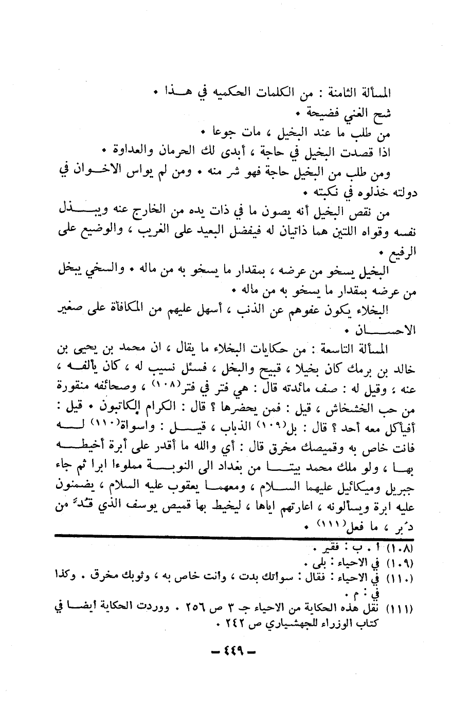 إِذا قصدت الْبَخِيل فِي حَاجَة أبدى لَك الحرمان والعداوة فَهُوَ شَرّ مِنْهُ وَمن لم يواس الإخوان فِي دولته خذلوه فِي نكبته
