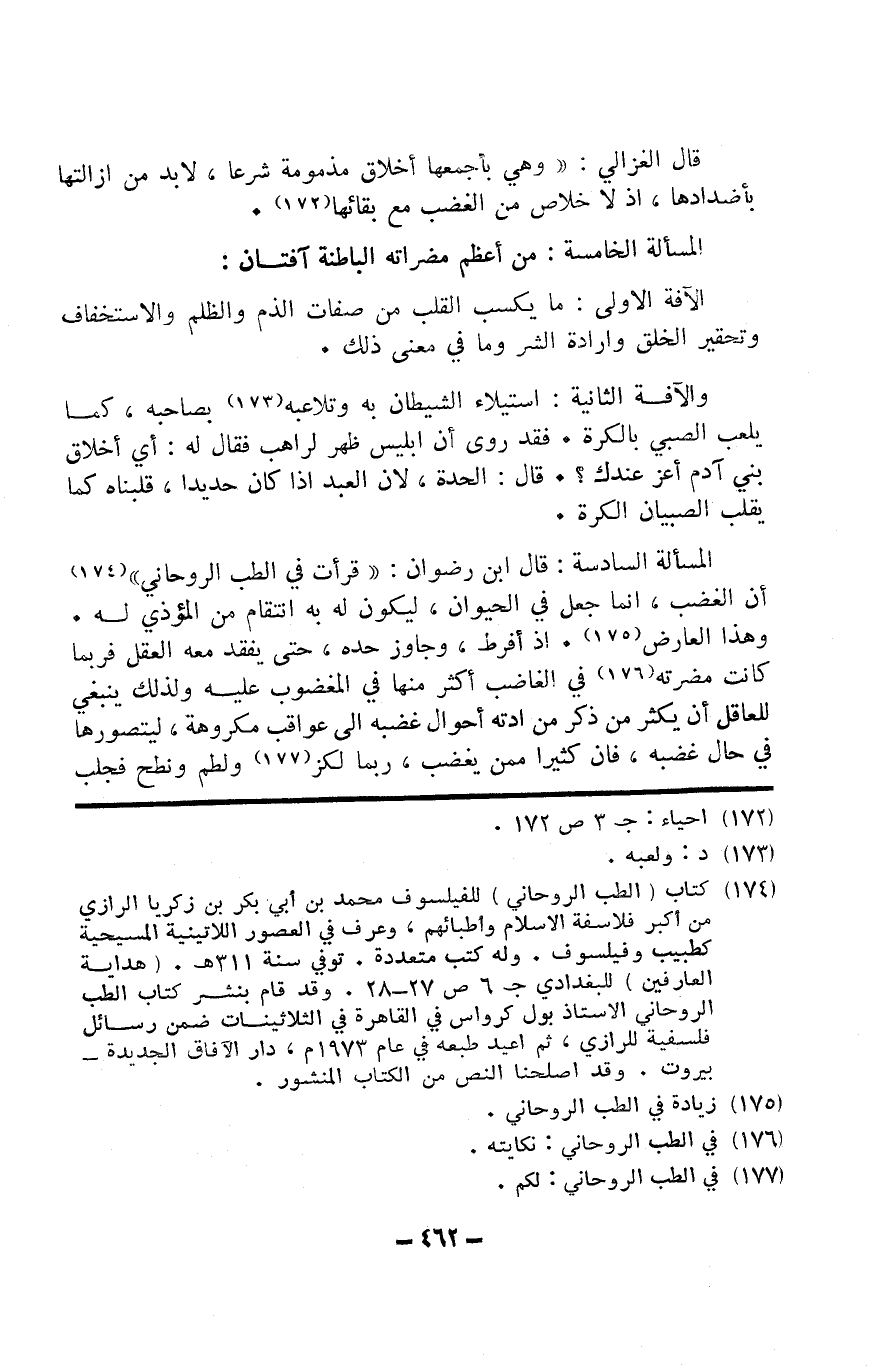 الْمَسْأَلَة السَّادِسَة قَالَ ابْن رضوَان قَرَأت فِي الطِّبّ الروحاني أَن الْغَضَب إِنَّمَا جعل فِي الْحَيَوَان ليَكُون لَهُ بِهِ انتقام من المؤذي لَهُ وَهَذَا الْعَارِض إِذْ أفرط وَجَاوَزَ حَده حَتَّى يفقد مَعَه الْعقل فَرُبمَا كَانَت مضرته فِي الغاضب أَكثر مِنْهَا فِي المغضوب عَلَيْهِ وَلذَلِك يَنْبَغِي للعاقل أَن يكثر من ذكر من أداته أَحْوَال غَضَبه إِلَى عواقب مَكْرُوهَة ليتصورها فِي حَال غَضَبه فَإِن كثيرا مِمَّن يغْضب رُبمَا لكز وَلَطم ونطح فجلب