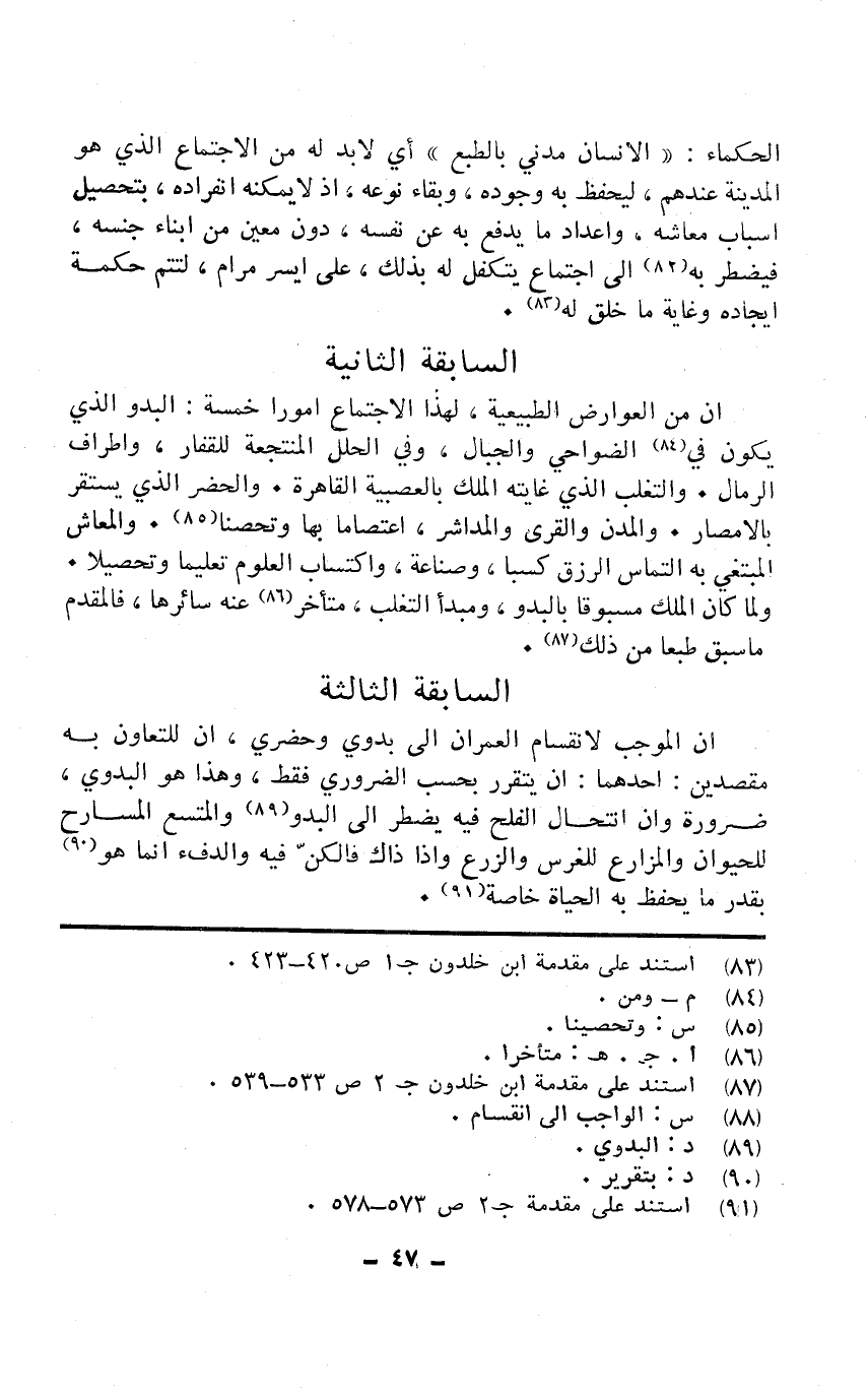 إِن من الْعَوَارِض الطبيعية لهَذَا الِاجْتِمَاع أمورا خَمْسَة البدو الَّذِي يكون فِي الضواحي وَالْجِبَال وَفِي الْحلَل المنتجعة للقفار وأطراف الرمال والتغلب الَّذِي غَايَته الْملك بالعصية الْقَاهِرَة والحضر الَّذِي يسْتَقرّ بالأمصار والمدن والقرى والمداشر اعتصاما بهَا وتحصنا والمعاش المبتغي بِهِ التمَاس الرزق كسبا وصناعة واكتساب الْعُلُوم تَعْلِيما وتحصيلا وَلما كَانَ الْملك مَسْبُوقا بالبدو ومبدأ التغلب مُتَأَخّر عَنهُ سائرها فالمتقدم مَا سبق طبعا من ذَلِك