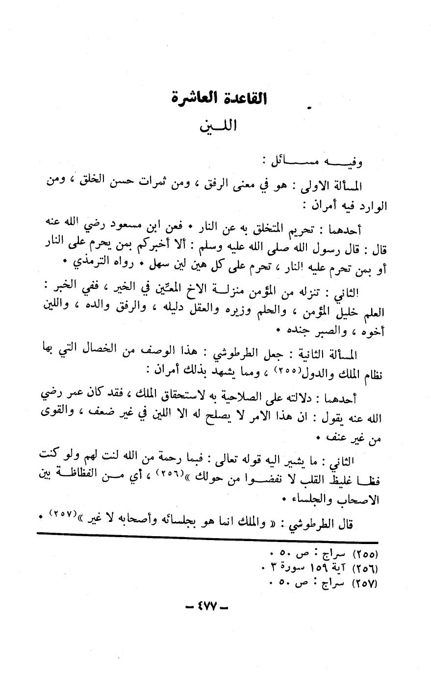 الْمَسْأَلَة الثَّانِيَة جعل الطرطوشي هَذَا الْوَصْف من الْخِصَال الَّتِي بهَا نظام الْملك والدول وَمِمَّا يشْهد بذلك أَمْرَانِ