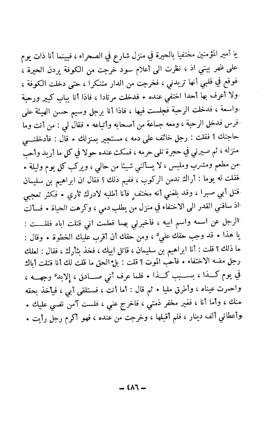 يَا أَمِير الْمُؤمنِينَ مختفيا فِي الْحيرَة فِي منزل شَارِع فِي الصَّحرَاء فَبَيْنَمَا أَنا ذَات يَوْم على ظهر بَيْتِي إِذْ نظرت إِلَى أَعْلَام سود خرجت من الْكُوفَة يردن الْحيرَة فَوَقع فِي قلبِي أَنَّهَا تريدني فَخرجت من الدَّار متنكرا حَتَّى دخلت الْكُوفَة وَلَا أعرف بهَا أحدا أختفي عِنْده فَدخلت مرتادا فَإِذا أَنا بِبَاب كَبِير ورحبة وَاسِعَة فَدخلت الرحبة فَجَلَست فِيهَا فَإِذا أَنا بِرَجُل وسيم حسن الْهَيْئَة على فرس فَدخل الرحبة وَمَعَهُ جمَاعَة من أَصْحَابه وَأَتْبَاعه فَقَالَ لي من أَنْت وَمَا حَاجَتك فَقلت رجل خَائِف على دَمه مستجير بمنزلك قَالَ فَأَدْخلنِي منزله ثمَّ صيرني فِي حجرَة تلِي حرمه فَمَكثت عِنْده حولا فِي كل مَا أُرِيد وَأحب من مطعم ومشرب وملبس لَا يسألني شَيْئا من حَالي ويركب كل يَوْم وَلَيْلَة فَقلت لَهُ يَوْمًا أَرَاك تدمن الرّكُوب فَفِيمَ ذَلِك فَقَالَ إِن إِبْرَاهِيم بن سُلَيْمَان قتل أبي صبرا وَقد بَلغنِي أَنه مختف فَأَنا أطلبه لأدرك ثَأْرِي فَكثر تعجبي إِذْ ساقني الْقدر إِلَى الاختفاء فِي منزل من يطْلب دمي فَكرِهت الْحَيَاة فَسَأَلت الرجل عَن اسْمه وَاسم أَبِيه فَأَخْبرنِي بهما فَعلمت أَنِّي قتلت أَبَاهُ فَقلت يَا هَذَا قد وَجب حَقك عَليّ وَمن حَقك أَن أقرب عَلَيْك الخطوة وَقَالَ مَا ذَلِك قلت أَنا إِبْرَاهِيم بن سُلَيْمَان قَاتل أَبِيك فَخذ بثأرك فَقَالَ لَعَلَّك رجل مضاه الاختفاء فَأحب الْمَوْت قلت بل الْحق مَا قلت لَك أَنا قتلت أَبَاك فِي يَوْم كَذَا بِسَبَب كَذَا فَلَمَّا عرف أَنِّي صَادِق إلابد وَجهه واحمرت عَيناهُ وأطرق مَلِيًّا ثمَّ قَالَ أما أَنْت فستلقى أبي فَيَأْخُذ بِحقِّهِ مِنْك وَأما أَنا فَغير مخفر ذِمَّتِي فَاخْرُج عني فلست آمن نَفسِي عَلَيْك وَأَعْطَانِي ألف دِينَار فَلم أقبلها وَخرجت من عِنْده فَهُوَ أكْرم رجل رَأَيْت