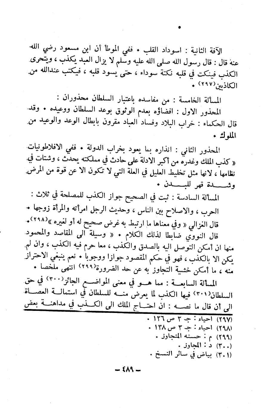 الْمَسْأَلَة السَّابِعَة مِمَّا هُوَ فِي معنى الْمَوَاضِع الْجَائِز فِي حق السُّلْطَان فِيهَا الْكَذِب لما يعرض مِنْهُ للسُّلْطَان فِي استمالة العصاة إِلَى أَن قَالَ مَا نَصه أَن احْتَاجَ الْملك إِلَى الذب فِي مداهنة بعض