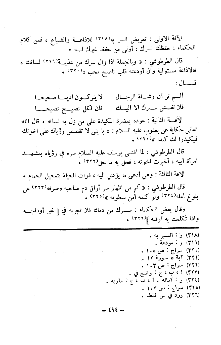قَالَ الطرطوشي كم من إِظْهَار سر أراق دم صَاحبه وَصَرفه عَن بُلُوغ أمله وَلَو كتمته أَمن سطوته