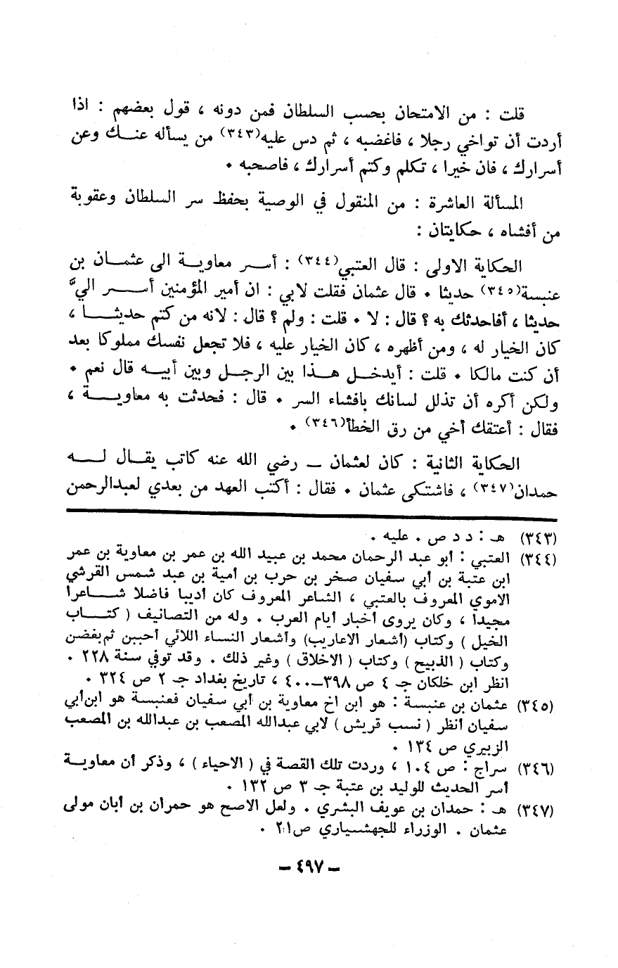 الْحِكَايَة الأولى قَالَ الْعُتْبِي أسر مُعَاوِيَة إِلَى عُثْمَان بن عَتبه حَدِيثا قَالَ عُثْمَان فَقلت لأبي أَن أَمِير الْمُؤمنِينَ أسر إِلَيّ حَدِيثا افأحدثك بِهِ قَالَ لَا قلت وَلم قَالَ لِأَنَّهُ من كتم حَدِيثا كَانَ الْخِيَار لَهُ وَمن أظهره كَانَ الْخِيَار عَلَيْهِ فَلَا تجْعَل نَفسك مَمْلُوكا بعد أَن كنت مَالِكًا قلت أَيَدْخُلُ هَذَا بَين الرجل وَبَين أَبِيه قَالَ نعم وَلَكِن أكره أَن تذلل لسَانك بإفشاء السِّرّ قَالَ فَحدثت بِهِ مُعَاوِيَة فَقَالَ أعتقك أخي من رق الْخَطَأ