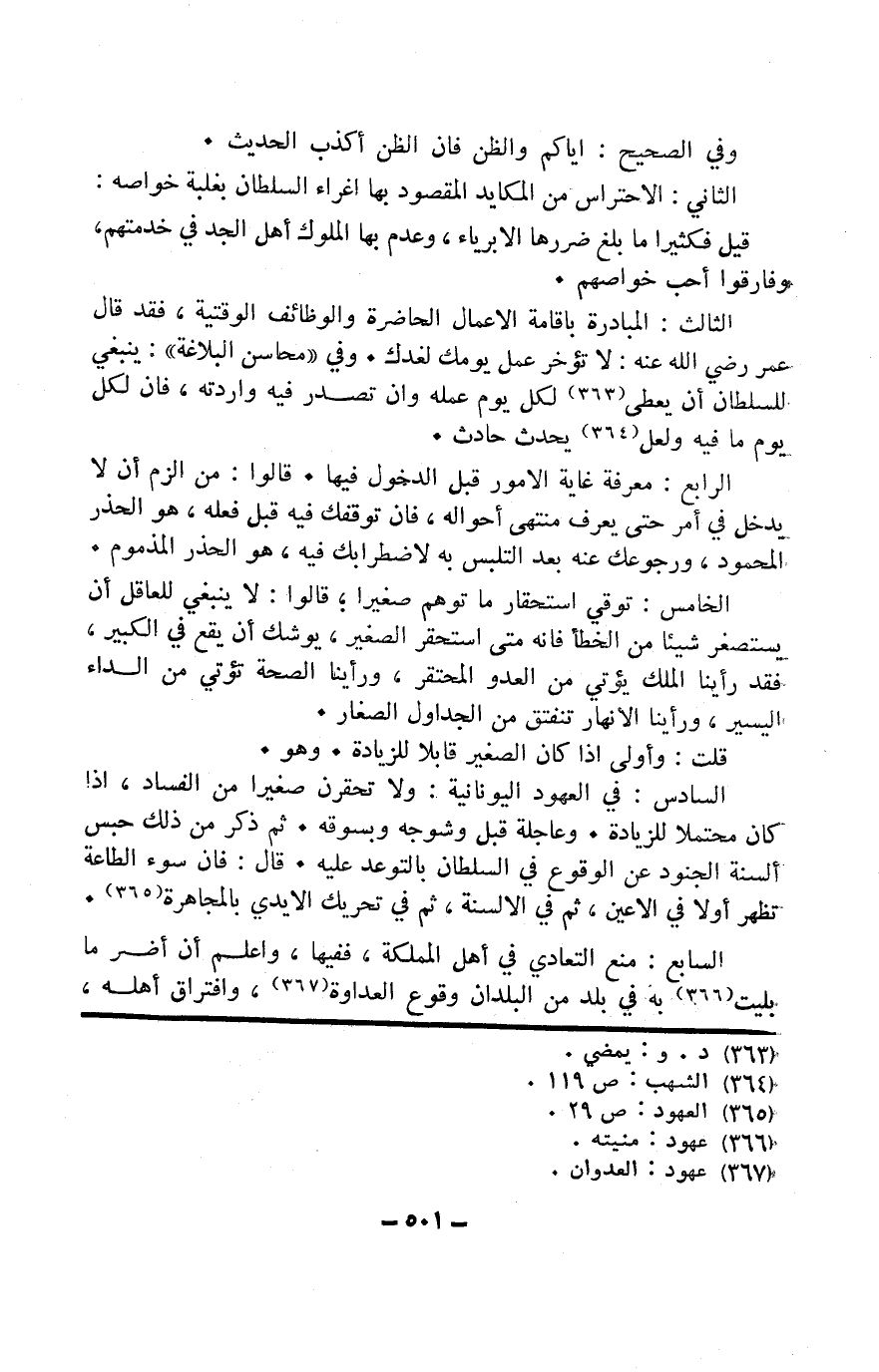 السَّادِس فِي العهود اليونانية وَلَا تحقرن صَغِيرا من الْفساد إِذا كَانَ مُحْتملا للزِّيَادَة وعاجلة قبل وشوجه وبسوقه ثمَّ ذكر من ذَلِك حبس أَلْسِنَة الْجنُود عَن الْوُقُوع فِي السُّلْطَان بالتوعد عَلَيْهِ قَالَ فَإِن سوء الطَّاعَة تظهر أملا فِي الْأَعْين ثمَّ فِي الْأَلْسِنَة ثمَّ فِي تَحْرِيك الْأَيْدِي بالمجاهرة