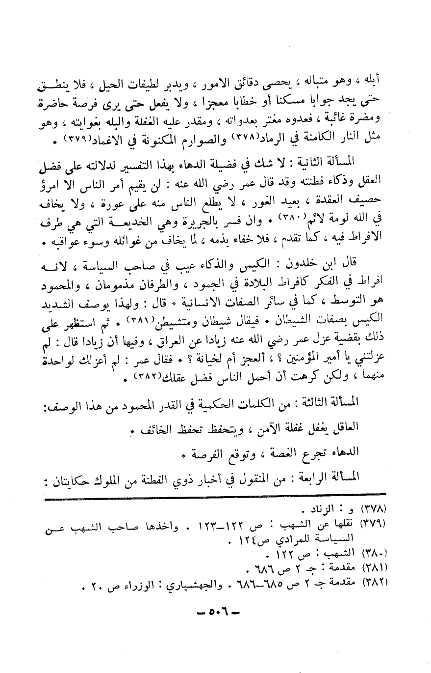 قَالَ ابْن خلدون الْكيس والذكاء عيب فِي صَاحب السياسة لِأَنَّهُ إفراط فِي الْفِكر كإفراط البلادة فِي الجمود والطرفان مذمومان والمحمود هُوَ التَّوَسُّط كَمَا فِي سَائِر الصِّفَات الإنسانية قَالَ وَلِهَذَا يُوصف الشَّديد الْكيس بِصِفَات الشَّيْطَان فَيُقَال شَيْطَان ومتشيطن ثمَّ استظهر على ذَلِك بقضية عزل عمر رَضِي الله عَنهُ زيادا عَن الْعرَاق وفيهَا أَن زيادا قَالَ لم عزلتي يَا أَمِير الْمُؤمنِينَ ألعجز أم لخيانة فَقَالَ عمر لم أعزلك لوَاحِدَة مِنْهُمَا وَلَكِن كرهت أَن أحمل النَّاس فضل عقلك