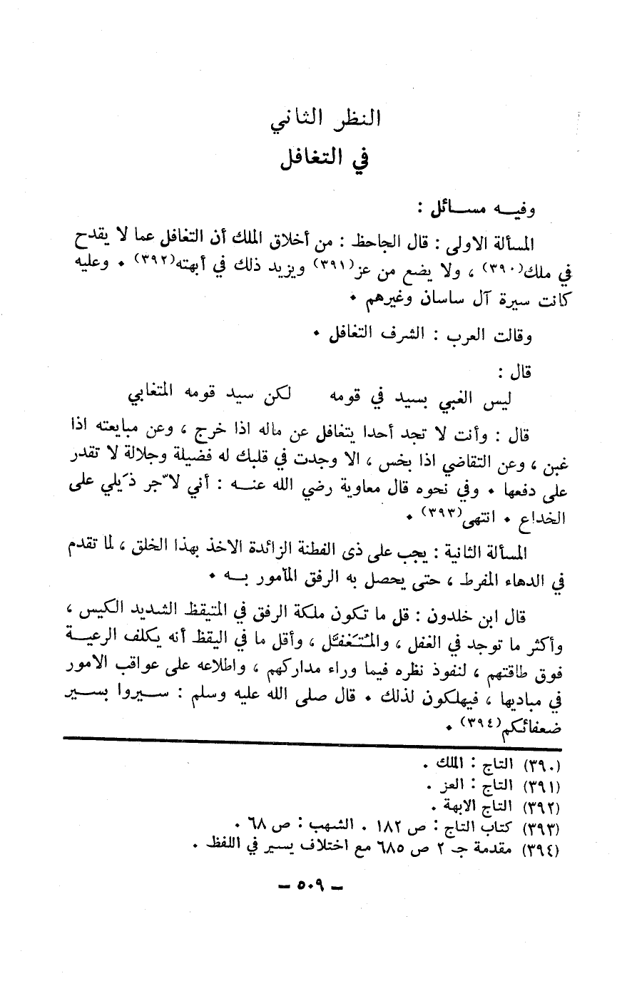 الْمَسْأَلَة الأولى قَالَ الجاحظ من أَخْلَاق الْملك أَن التغافل عَمَّا لَا يقْدَح فِي ملك وَلَا يضع من عز وَيزِيد ذَلِك فِي أبهته وَعَلِيهِ كَانَت سيرة آل ساسان وَغَيرهم