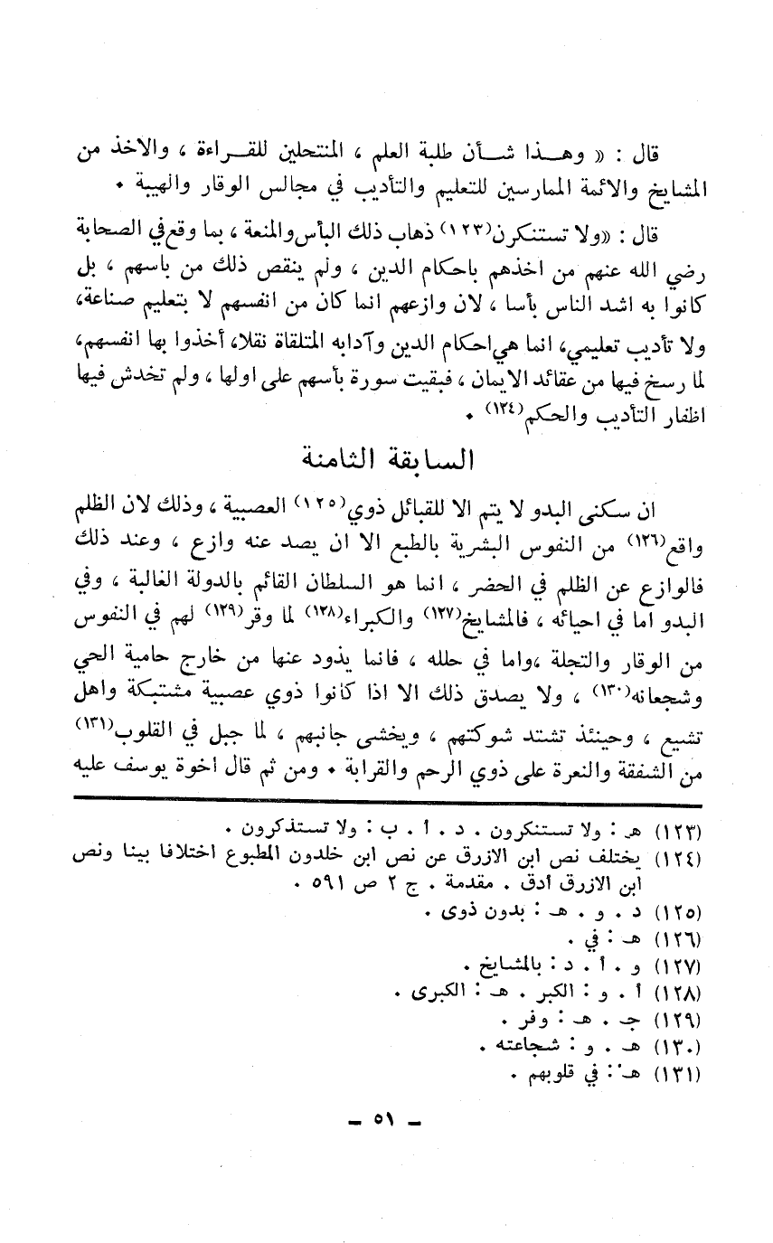 إِن سُكْنى البد لَا يتم إِلَّا للقبائل ذَوي العصبية وذل لِأَن الظُّلم وَاقع من النُّفُوس البشرية بالطبع إِلَّا أَن يصد عَنهُ وازع وَعند ذَلِك فالوازع عَن الظُّلم فِي الْحَضَر إِنَّمَا هُوَ السُّلْطَان الْقَائِم بالدولة الْغَالِبَة وَفِي البدو أما فِي أحيائه فالمشايخ والكبراء لما وقر لَهُم فِي النُّفُوس من الْوَقار والتجلة وَأما فِي حلله فَإِنَّمَا يذود عَنْهَا من خَارج حامية الْحَيّ وشجعانه وَلَا يصدق ذَلِك إِلَّا إِذا كَانُوا ذَوي عصبية مشتبكة وَأهل تشيع وَحِينَئِذٍ تشتد شوكتهم ويخشى جانبهم لما جبل فِي الْقُلُوب من الشَّفَقَة والنعرة على ذَوي الرَّحِم والقرابة وَمن ثمَّ قَالَ اخوة يُوسُف عَلَيْهِ