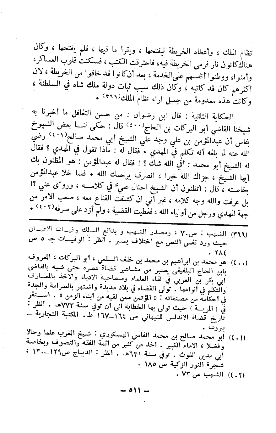 الْحِكَايَة الثَّانِيَة قَالَ ابْن رضوَان من حسن التغافل مَا أخبرنَا بِهِ شَيخنَا القَاضِي أَبُو البركات بن الْحَاج قَالَ حكى لنا بعض الشُّيُوخ بفاس أَن عبد الْمُؤمن بن عَليّ وجد عَليّ الشَّيْخ أبي مُحَمَّد صَالح رَضِي الله عَنهُ لما بلغه أَنه تكلم فِي الْمهْدي فَقَالَ لَهُ مَاذَا تَقول فِي الْمهْدي فَقَالَ لَهُ الشَّيْخ أَبُو مُحَمَّد أَفِي الله شكّ فَقَالَ لَهُ عبد الْمُؤمن هُوَ المظنون بك أَيهَا الشَّيْخ جَزَاك الله خيرا انْصَرف يَرْحَمك الله فَلَمَّا خلا عبد الْمُؤمن بخاصته قَالَ أتظنون أَن الشَّيْخ احتال عَليّ فِي كَلَامه وروى عني بل عرفت وَالله وَجه كَلَامه غير أَنِّي إِن كشفت القناع مَعَه صَعب الْأَمر من جِهَة الْمهْدي وَرجل من أَوْلِيَاء الله فغطيت الْقَضِيَّة وَلم أَزْد على صرفه