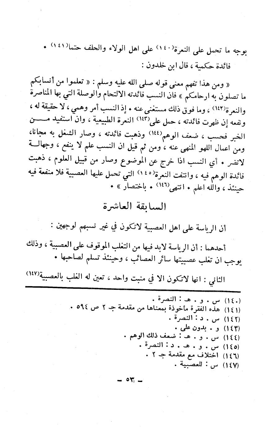 وَمن هَذَا تفهم معنى قَوْله صلى الله عَلَيْهِ وَسلم تعلمُوا من أنسابكم مَا تصلونَ بِهِ أَرْحَامكُم فغن النّسَب فَائِدَة الالتحام والوصلة الَّتِي بهَا المناصرة والنعرة وَمَا فَوق ذَلِك مُسْتَغْنى عَنهُ إِذْ النّسَب أَمر وهمي لَا حَقِيقَة لَهُ ونفعه إِن ظَهرت فَائِدَة حمل على النعرة الطبيعية وَأَن أستفيد من الْخَبَر فَحسب ضعف الْوَهم وَذَهَبت فَائِدَته وَصَارَ الشّغل بِهِ مجَّانا وَمن أَعمال اللَّهْو الْمنْهِي عنة وَمن ثمَّ قيل أَن النّسَب علم لَا ينفع وجهالة لَا تضر أَي النّسَب إِذا خرج عَن الْمَوْضُوع وَصَارَ من قبيل الْعُلُوم ذهبت فَائِدَة الْوَهم فِيهِ واتفقت النعرة الَّتِي تحمل عَلَيْهَا العصبية فَلَا مَنْفَعَة فِيهِ حِينَئِذٍ وَالله اعْلَم انْتهى بِاخْتِصَار