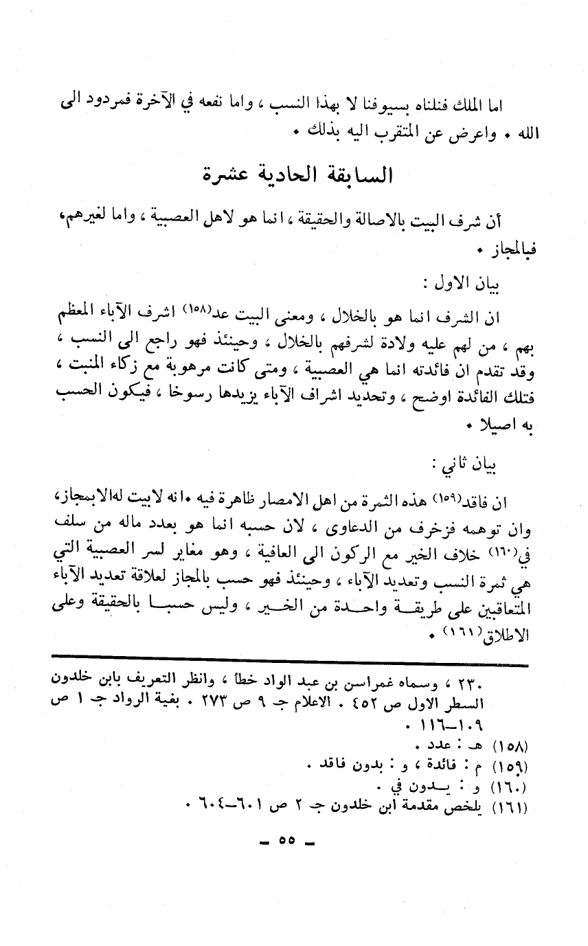 أَن الشّرف إِنَّمَا هُوَ بالخلال وَمعنى الْبَيْت عد أشرف الْآبَاء الْمُعظم بهم من لَهُم عَلَيْهِ ولادَة لشرفهم بالخلال وَحِينَئِذٍ فَهُوَ رَاجع غلى النّسَب وَقد تقدم أَن فَائِدَته إِنَّمَا هِيَ العصبية وَمَتى كَانَت مرهوبة مَعَ زكاء المنبت فَتلك الْفَائِدَة أوضح وتحديد أَشْرَاف الْآبَاء يزيدها رسوخا فَيكون الْحسب بِهِ أصيلا