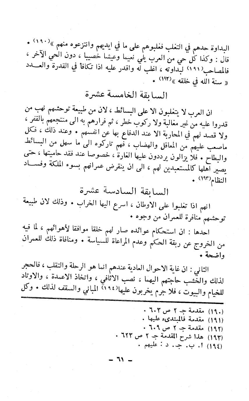 إِن الْعَرَب لَا يتغلبون إِلَّا على البسائط لِأَن من طبيعة توحشهم نهب من قدرُوا عَلَيْهِ من غير مغالبة وَلَا ركُوب خطر ثمَّ فرارهم بِهِ إِلَى منتجعهم بالقفر وَلَا قصد لَهُم بالمحاربة إِلَّا عِنْد الدفاع بهَا عَن أنفسهم وَعند ذَلِك فَكل مَا صَعب عَلَيْهِم من المعاقل والهضاب فهم تاركوه إِلَى مَا سهل من البسائط والبطاح فَلَا يزالون يرددون عَلَيْهَا الْغَارة خُصُوصا عِنْد فقد حاميتها حَتَّى يصير أَهلهَا كالمستعبدين لَهُم إِلَى أَن ينقرض عمرانهم بِسوء الملكة وَفَسَاد النظام