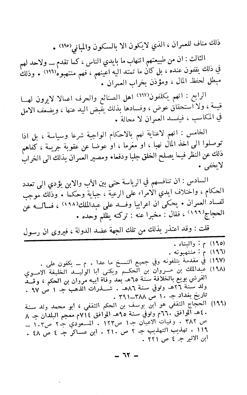 الثَّالِث إِن من طبيعتهم نهب مَا بأيدي النَّاس كَمَا تقدم وَلَا حد لَهُم فِي ذَلِك يقفون عِنْده بل كَانَ مَا تمتد إِلَيْهِ أَعينهم فهم منتهبوه وَذَلِكَ مُبْطل لحفظ المَال ومؤذن بخراب الْعمرَان