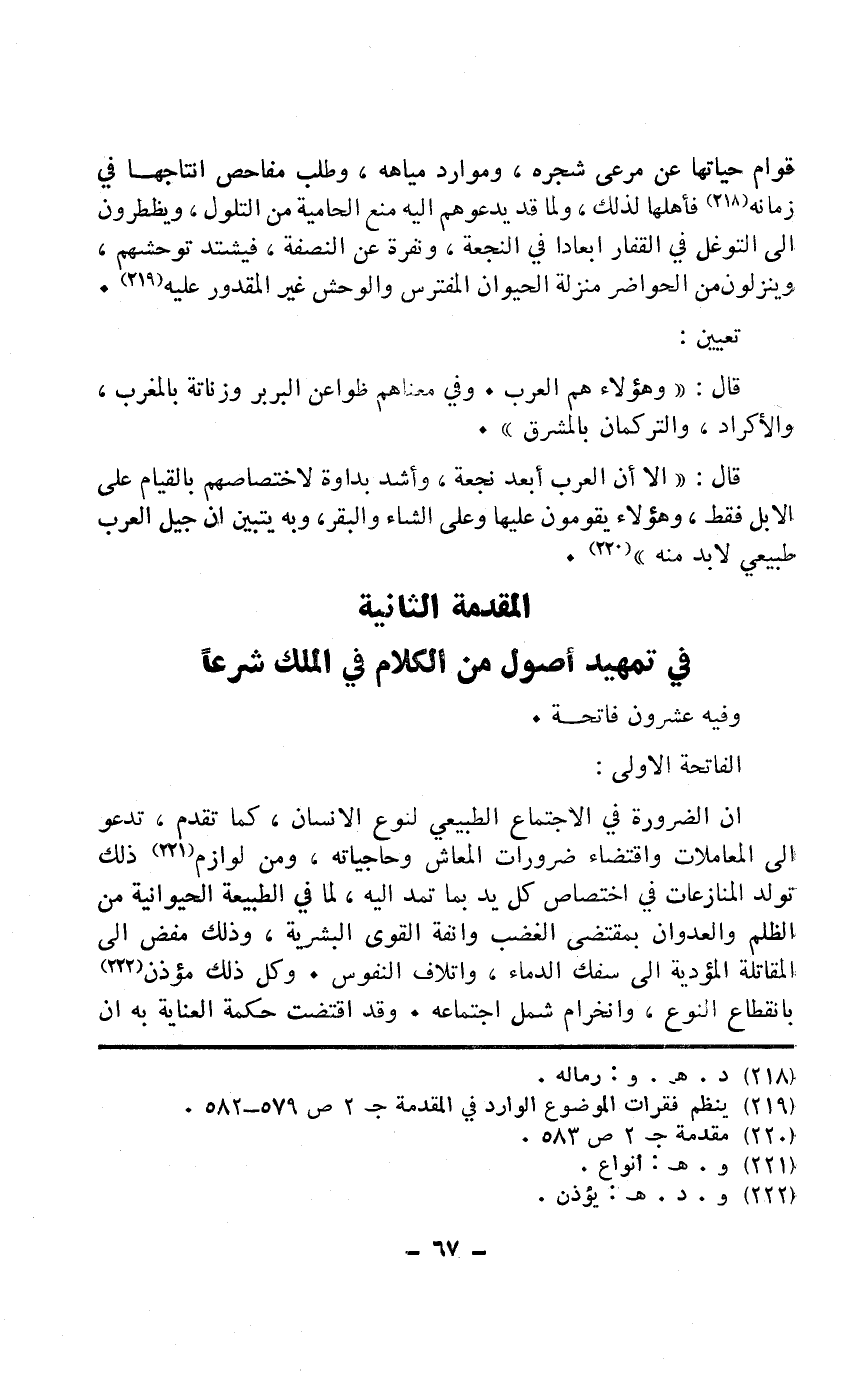إِن الضَّرُورَة فِي الِاجْتِمَاع الطبيعي لنَوْع الْإِنْسَان كَمَا تقدم تَدْعُو إِلَى الْمُعَامَلَات واقتضاء ضرورات المعاش وحاجياته وَمن لَوَازِم ذَلِك تولد المنازعات فِي اخْتِصَاص كل بلد بِمَا تمد إِلَيْهِ لما فِي الطبيعة الحيوانية من الظُّلم والعدوان بِمُقْتَضى الْغَضَب وأنفة القوى البشرية وَذَلِكَ مفض إِلَى الْمُقَاتلَة المؤدية إِلَى سفك الدِّمَاء وَإِتْلَاف النُّفُوس وكل ذَلِك مُؤذن بِانْقِطَاع النَّوْع وانخرام شَمل اجتماعه وَقد اقْتَضَت حِكْمَة الْعِنَايَة بِهِ أَن