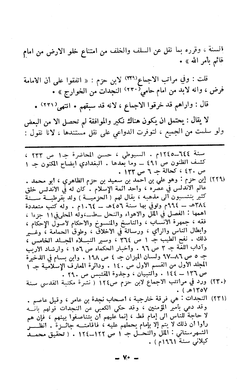 قلت وَفِي مَرَاتِب الْإِجْمَاع لِابْنِ حزم اتَّفقُوا على أَن الْإِمَامَة فرض وَأَنه لابد من إِمَام حامي النجدات من الْخَوَارِج