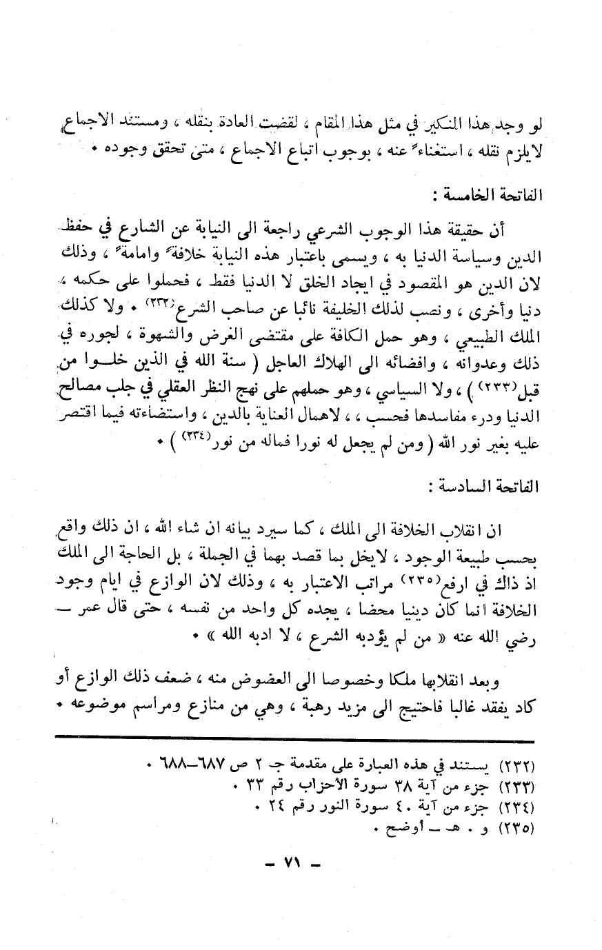 إِن حَقِيقَة هَذَا الْوُجُوب الشَّرْعِيّ رَاجِعَة إِلَى النِّيَابَة عَن الشَّارِع فِي حفظ الدّين وسياسة الدُّنْيَا بِهِ وَيُسمى بِاعْتِبَار هَذِه خلَافَة وإمامة وَذَلِكَ لِأَن الدّين هُوَ الْمَقْصُود فِي إِيجَاد الْخلق لَا الدُّنْيَا فَقَط فحملوا على حكمه دنيا وَأُخْرَى وَنصب لذَلِك الْخَلِيفَة نَائِبا عَن صَاحب الشَّرْع وَلَا كَذَلِك الْملك الطبيعي وَهُوَ حمل الكافة على مُقْتَضى الْغَرَض والشهوة لجوره فِي ذَلِك وعدوانه وإفضائه إِلَى الْهَلَاك العاجل سنة الله فِي الَّذين خلو من قبل وَلَا السياسي وَهُوَ حملهمْ على نهج النّظر الْعقلِيّ فِي جلب مصَالح الدُّنْيَا ودرء مفاسدها فَحسب لإهمال الْعِنَايَة بِالدّينِ واستضاءته فِيمَا اقْتصر عَلَيْهِ بِغَيْر نور الله {وَمن لم يَجْعَل الله لَهُ نورا فَمَا لَهُ من نور}