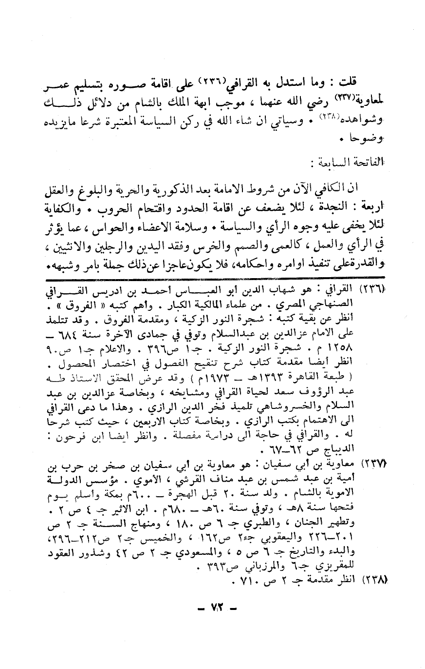 قلت وَمَا اسْتدلَّ بِهِ الْقَرَافِيّ على إِقَامَة صوره بِتَسْلِيم عمر لمعاوية رَضِي الله عَنْهُمَا مُوجب أبهة الْملك باشام من دَلَائِل ذَلِك وشواهده وَسَيَأْتِي إِن شَاءَ الله فِي ركن السياسة الْمُعْتَبرَة شرعا مَا يزِيدهُ وضوحا