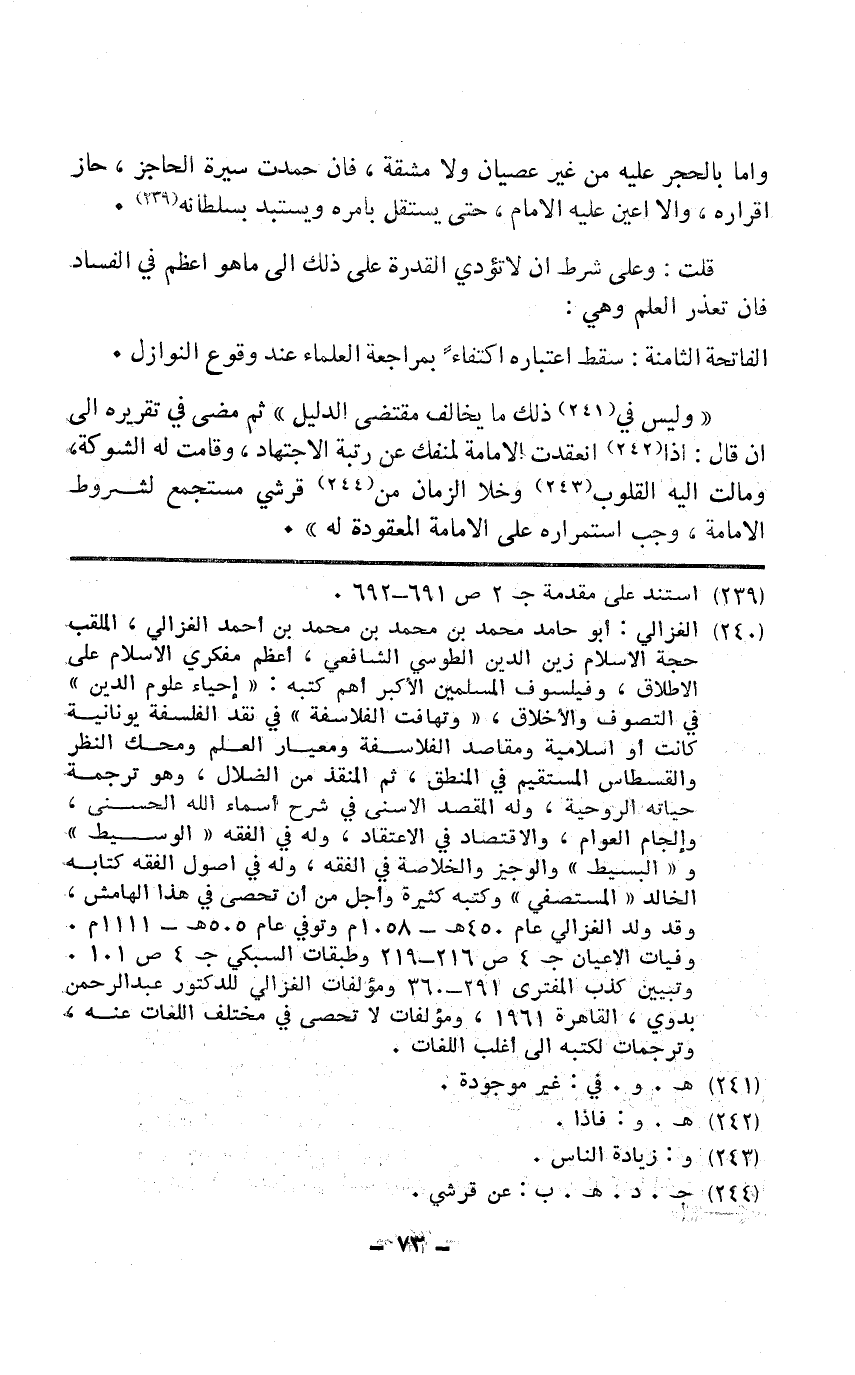 وَلَيْسَ ذَلِك مَا يُخَالف مُقْتَضى الدَّلِيل ثمَّ مضى فِي تَقْرِيره إِلَى أَن قَالَ إِذا انْعَقَدت الْإِمَامَة لمنقك عَن رُتْبَة الِاجْتِهَاد وَقَامَت لَهُ الشَّوْكَة ومالت إِلَيْهِ الْقُلُوب وخلا الزَّمَان من قرشي مستجمع لشروط الْإِمَامَة وَجب استمراره على الْإِمَامَة المعقودة لَهُ