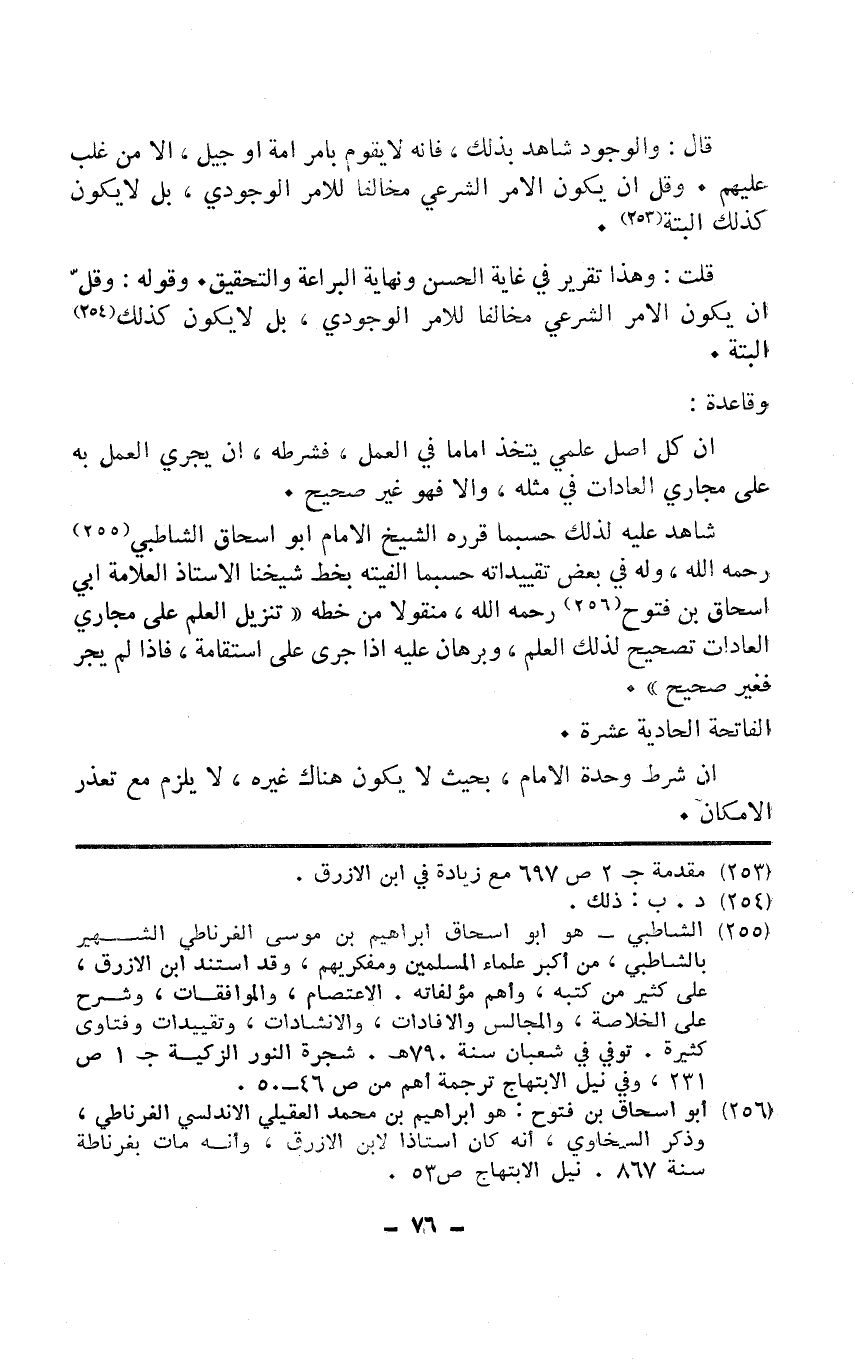 شَاهد عَلَيْهِ لذَلِك حَسْبَمَا قَرَّرَهُ الشَّيْخ الإِمَام أَبُو إِسْحَاق الشاطبي رَحمَه الله وَله فِي بعض تقييداته حَسْبَمَا الفيته بِخَط شَيخنَا الْأُسْتَاذ الْعَلامَة أبي إِسْحَاق بن فتوح رَحمَه الله مَنْقُولًا من خطة تَنْزِيل الْعلم على مجاري الْعَادَات تَصْحِيح لذَلِك الْعلم وبرهان عَلَيْهِ إِذا جرى على استقامة فَإِذا لم يجر فَغير صَحِيح
