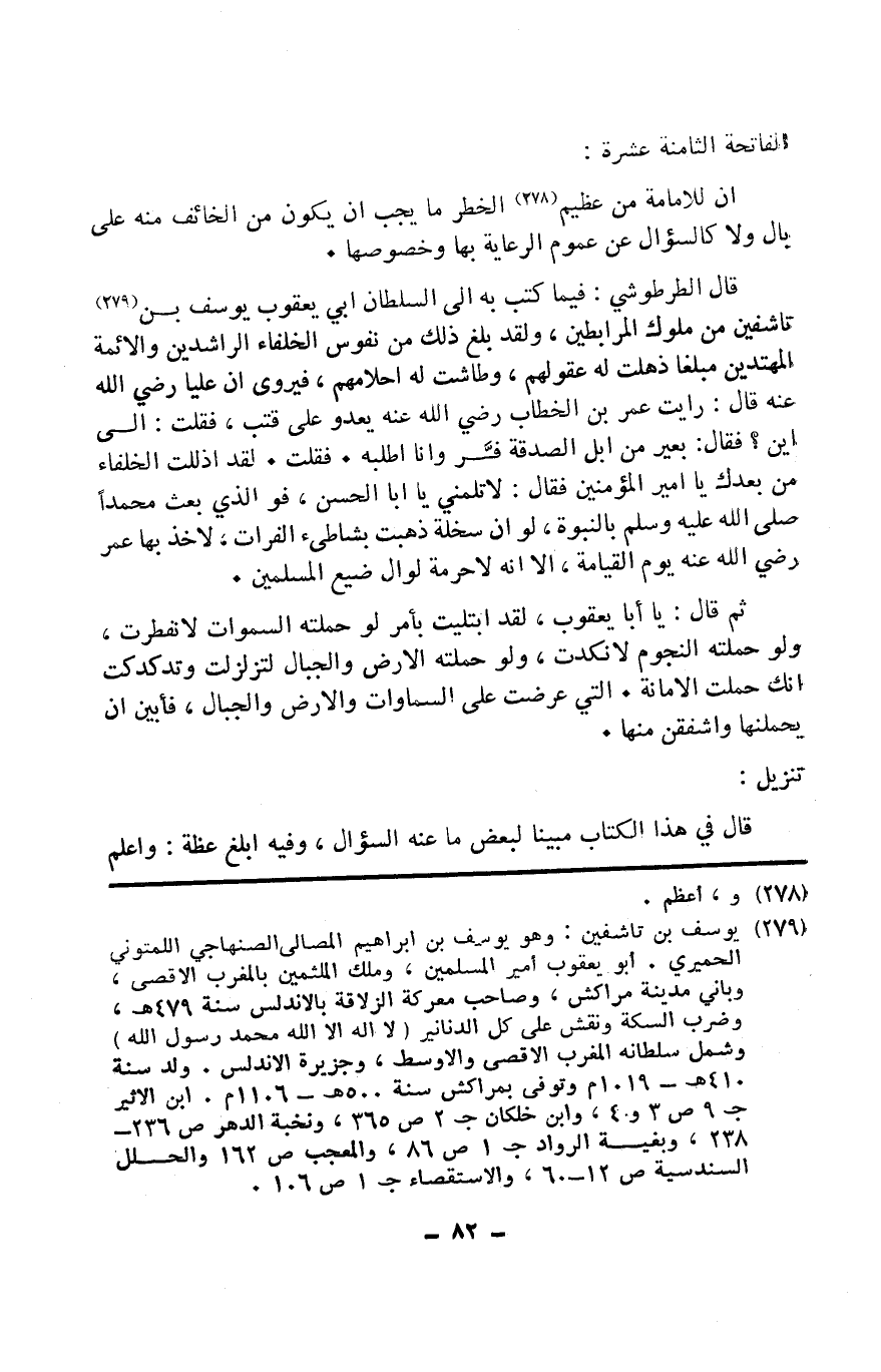 قَالَ الطرطوشي فِيمَا كتب بِهِ إِلَى السُّلْطَان أبي يَعْقُوب يُوسُف بن تاشفين من مُلُوك المرابطين وَلَقَد بلغ ذَلِك نفوس الْخُلَفَاء الرَّاشِدين وَالْأَئِمَّة المهتدين مبلغا ذهلت لَهُ عُقُولهمْ وطاشت لَهُ أحلامهم فيروى أَن عليا رَضِي الله عَنهُ قَالَ رَأَيْت عمر بن الْخطاب رَضِي الله عَنهُ يعدو على قتب فَقلت إِلَى أَيْن فَقَالَ بعير من إبل الصَّدَقَة فر وَأَنا أطلبه فَقلت لقد أذللت الْخُلَفَاء من بعْدك يَا أَمِير الْمُؤمنِينَ فَقَالَ لَا تلمني يَا أَبَا الْحسن فو الَّذِي بعث مُحَمَّد صلى الله عَلَيْهِ وَسلم بِالنُّبُوَّةِ لَو أَن سخلة ذهبت بشاطئ الْفُرَات لأخذ بهَا عمر يَوْم الْقِيَامَة أَلا خُذ بهَا عمر يَوْم الْقِيَامَة أَلا نه لَا حُرْمَة لوالي ضيع الْمُسلمين