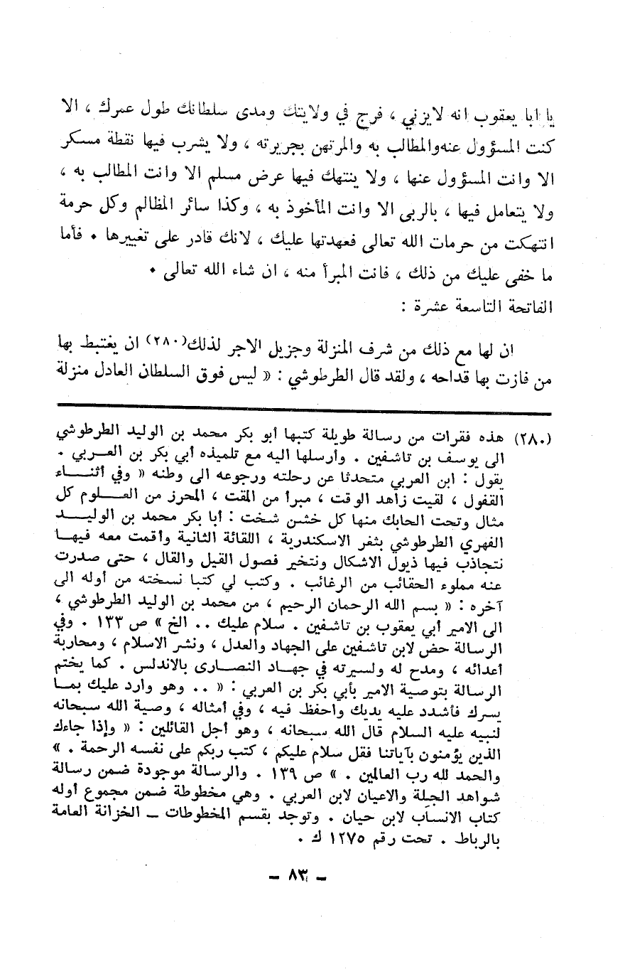 يَا أَبَا يَعْقُوب أَنه لَا يَزْنِي فرج فِي ولايتك ومدى سلطانك طول عمرك إِلَّا كنت المسؤول عَنهُ والمطالب بِهِ وَالْمُرْتَهن بجريرته وَلَا يشرب فِيهَا نقطة مُسكر إِلَّا وَأَنت المسؤول عَنْهَا وَلَا ينتهك فِيهَا عرض مُسلم إِلَّا وَأَنت المطالب بِهِ وَلَا يتعامل فِيهَا بالربى إِلَّا وَأَنت الْمَأْخُوذ بِهِ وَكَذَا سَائِر الْمَظَالِم وكل حُرْمَة انتهكت من حرمات الله تَعَالَى فعهدتها عَلَيْك لِأَنَّك قَادر على تغييرها فَأَما مَا خَفِي عَلَيْك من ذَلِك فَأَنت المبرأ مِنْهُ إِن شَاءَ الله تَعَالَى