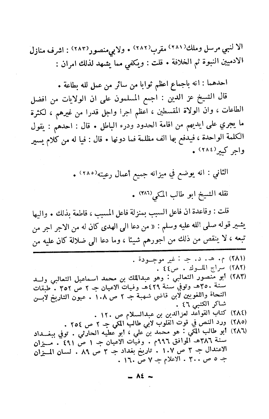 قَالَ الشَّيْخ عز الدّين أجمع الْمُسلمُونَ على أَن الولايات من أفضل الطَّاعَات وَأَن الْوُلَاة المقسطين أعظم أجرا وَأجل قدرا من غَيرهم لِكَثْرَة مَا يجْرِي على أَيْديهم من إِقَامَة الْحُدُود ودرء الْبَاطِل قَالَ أحدهم يَقُول الْكَلِمَة الْوَاحِدَة فَيدْفَع بهَا ألف مظْلمَة فَمَا دونهَا قَالَ فيا لَهُ من كَلَام يسير وَأجر كَبِير