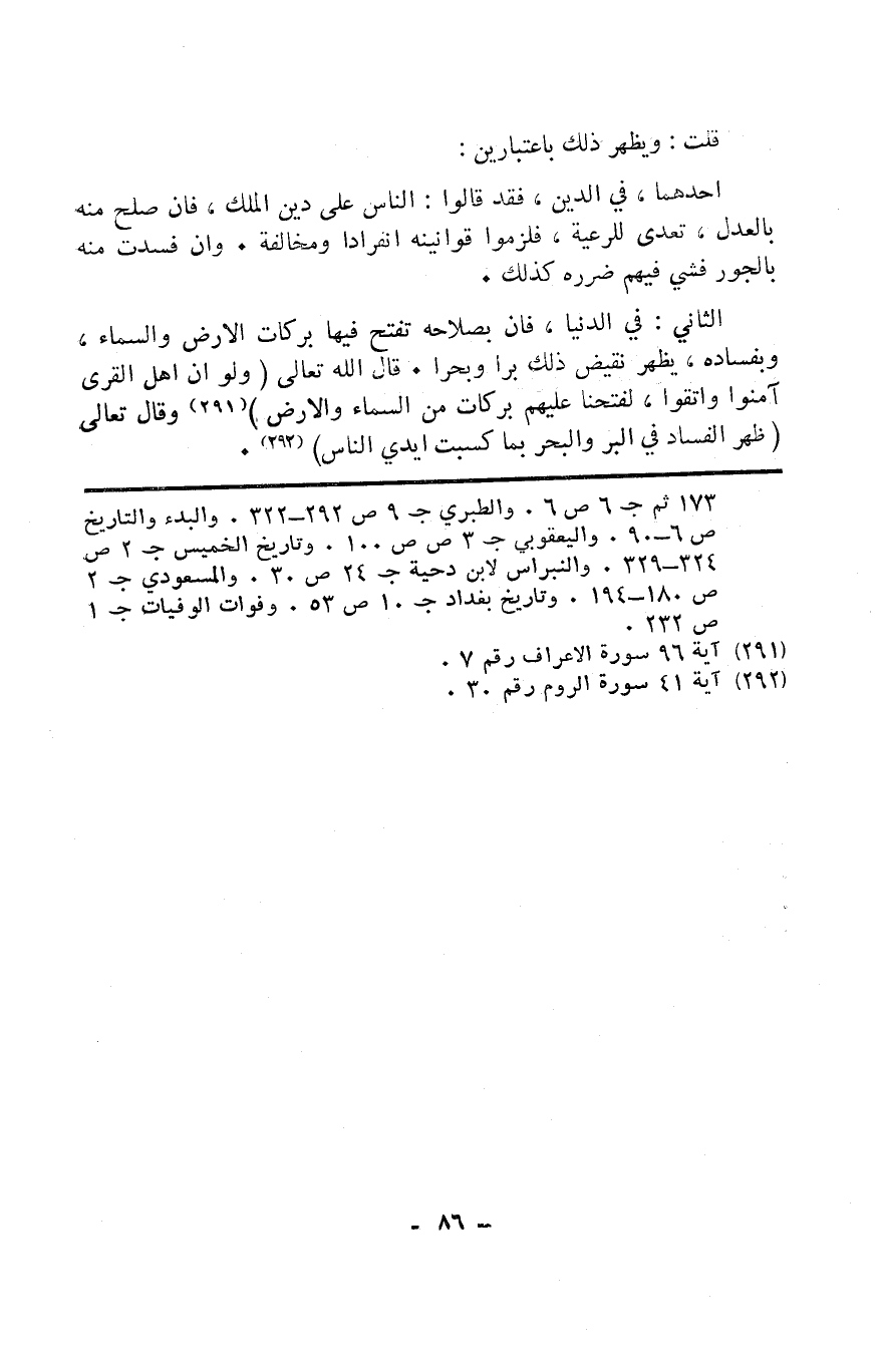 أَحدهمَا فِي الدّين فقد قَالُوا النَّاس على دين الْملك فَإِن صلح مِنْهُ بِالْعَدْلِ تعدى الرّعية فلزموا قوانينه انفرادا وَمُخَالفَة وَإِن فَسدتْ مِنْهُ بالجور فشي فيهم ضَرَره كَذَلِك
