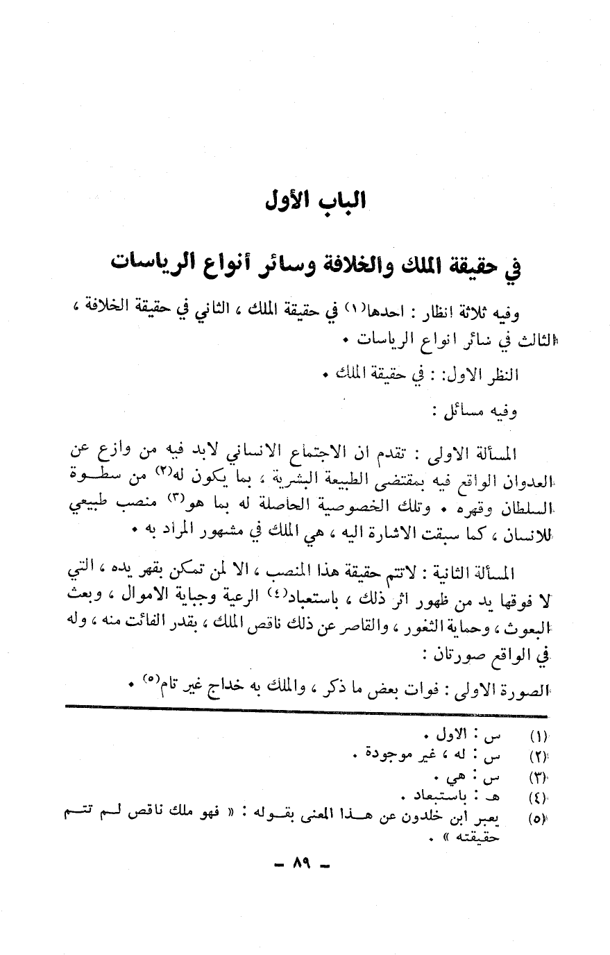 الْمَسْأَلَة الأولى تقدم أَن الِاجْتِمَاع الإنساني لابد فِيهِ من وازع عَن الْعدوان الْوَاقِع فِيهِ بِمُقْتَضى الطبيعة البشرية بِمَا يكون لَهُ من سطوة السُّلْطَان وقهره وَتلك الخصوصية الْحَاصِلَة لَهُ بِمَا هُوَ منصب طبيعي للْإنْسَان كَمَا سبقت الْإِشَارَة غليه هِيَ الْملك فِي مَشْهُور المُرَاد بِهِ