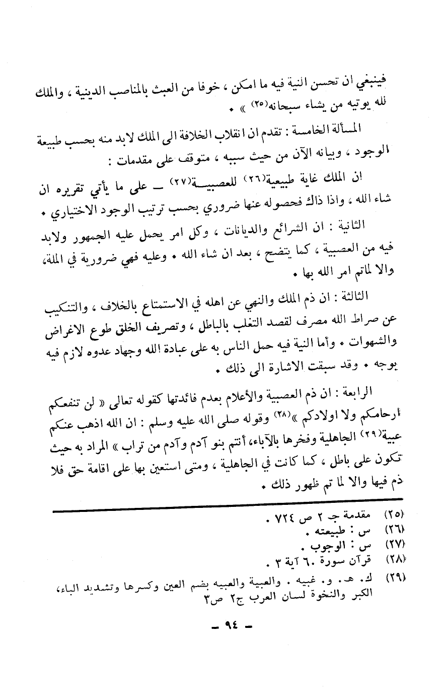الثَّانِيَة أَن الشَّرَائِع والديانات وكل أَمر يحمل عَلَيْهِ الْجُمْهُور وَلَا بُد فِيهِ من العصبية كَمَا يَتَّضِح بعد إِن شَاءَ الله وَعَلِيهِ فَهِيَ ضَرُورِيَّة فِي الْملَّة وَإِلَّا لما تمّ أَمر الله بهَا