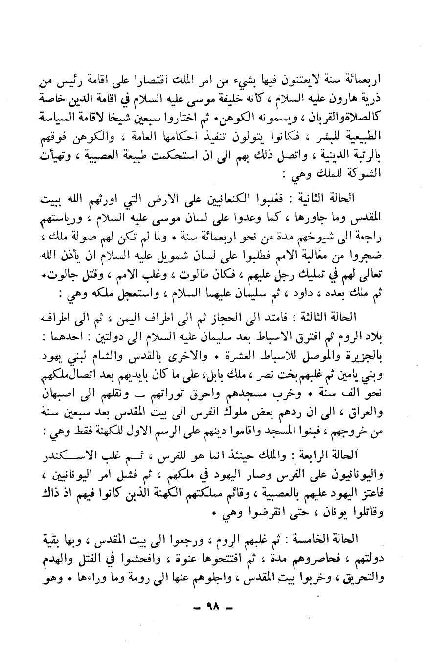 الْحَالة الثَّانِيَة فغلبوا الكنعانيين على الأَرْض الَّتِي أورثهم الله بِبَيْت الْمُقَدّس وَمَا جاوروها كَمَا وعدوا على لِسَان مُوسَى عَلَيْهِ السَّلَام ورياستهم رَاجِعَة إِلَى شيوخهم مُدَّة من نَحْو أَرْبَعمِائَة سنة وَلما لم بكم لَهُم صولة ملك ضجروا من مغالبة الْأُمَم فطلبوا على لِسَان شمويل عَلَيْهِ السَّلَام أَن يَأْذَن الله تَعَالَى لَهُم فِي تمْلِيك رجل عَلَيْهِم فَكَانَ طالوت وَغلب الْأُمَم وفتل جالوت ثمَّ ملك بعده دَاوُد ثمَّ سُلَيْمَان عَلَيْهِمَا السَّلَام واستعجل ملكه وَهِي الْحَالة الثَّالِثَة فامتد غلى الْحجاز ثمَّ غلى أَطْرَاف الْيمن ثمَّ إِلَى أَطْرَاف بِلَاد الرّوم ثمَّ افترق الأسباط بعد سُلَيْمَان عَلَيْهِ السَّلَام إِلَى دولتين أَحدهمَا بالجزيرة والموصل للأسباط الْعشْرَة وَالْأُخْرَى بالقدس والسام لبني يهود وَبَين يَامِين ثمَّ غلبهم بخت نثر ملك بابل على مَا كَانَ بِأَيْدِيهِم بعد اتِّصَال ملكهم نَحْو ألف سنة وَخرب مَسْجِدهمْ وأحرق توراتهم ونقلهم إِلَى أَصْبَهَان وَالْعراق إِلَى أَن ردهم بعض ملك الْفرس إِلَى بَيت الْمُقَدّس بعد سبعين سنة من خُرُوجهمْ فبنوا الْمَسْجِد وَأَقَامُوا دينهم على الرَّسْم الأول للكهنة فَقَط وَهِي