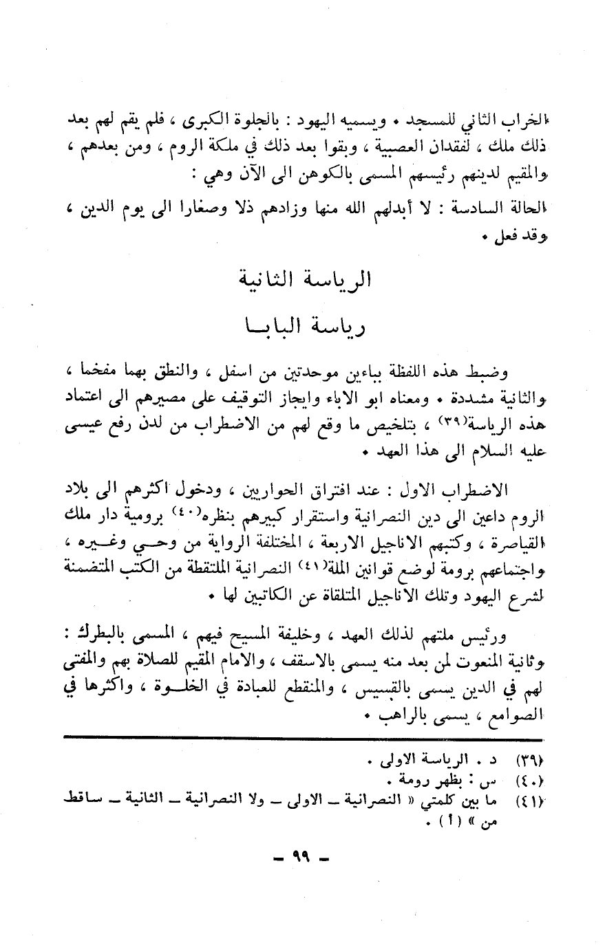 رَئِيس ملتهم لذَلِك الْعَهْد وَخَلِيفَة الْمَسِيح فيهم الْمُسَمّى بالبطرك وثانية المنعوت لمن بعد مِنْهُ يُسمى بالأسقف وَالْإِمَام الْمُقِيم للصَّلَاة بهم والمفتي لَهُم فبالدين يُسمى بالقسيس والمنقطع لِلْعِبَادَةِ فِي الْخلْوَة وأكثرها فِي الصوامع يُسمى بِالرَّاهِبِ