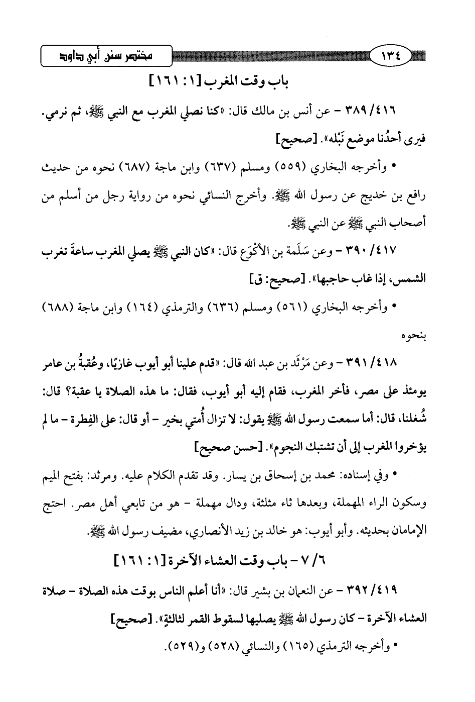418/ 391 - وعن مَرْثَد بن عبد اللَّه قال: "قدم علينا أبو أيوب غازيًا، وعُقبةُ بن عامر يومئذ على مصر، فأخر المغرب، فقام إليه أبو أيوب، فقال: ما هذه الصلاة يَا عقبة؟ قال: شُغلنا، قال: أما سمعت رسول اللَّه -صلى اللَّه عليه وسلم- يقول: لا تزال أُمتي بخير -أو قال: على الفِطرة- ما لم يؤخروا المغرب إلى أن تشتبك النجوم".hحسن صحيح]