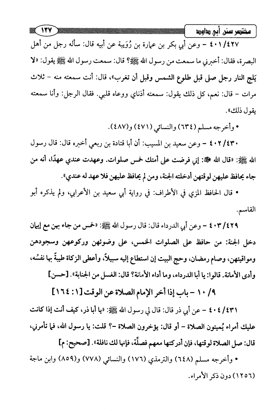 427/ 401 - وعن أبي بكر بن عمارة بن رُوَيبة عن أبيه قال: سأله رجل من أهل البصرة، فقال: أخبرني ما سمعت من رسول اللَّه -صلى اللَّه عليه وسلم-؟ قال: سمعت رسول اللَّه -صلى اللَّه عليه وسلم- يقول: "لا يَلج النار رجل صلى قبل طلوع الشمس وقبل أن تغرب"، قال: أَنْتَ سمعته منه -ثلاث مرات- قال: نعم، كل ذلك يقول: سمعته أذناي ووعاه قلبي. فقال الرجل: وأنا سمعته يقول ذلك".