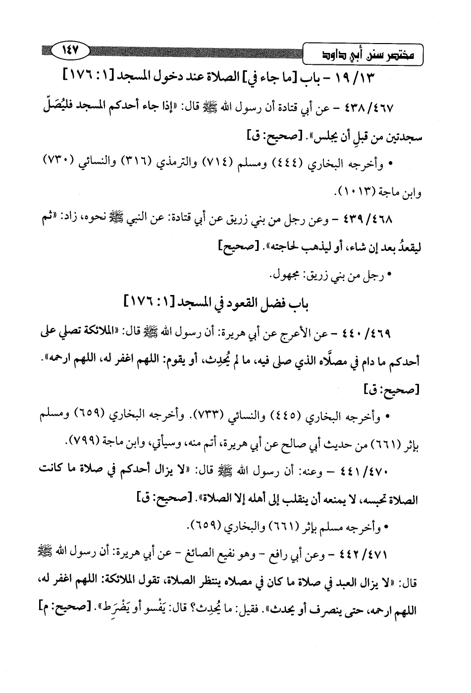 467/ 438 - عن أبي قتادة أن رسول اللَّه -صلى اللَّه عليه وسلم- قال: "إذا جاء أحدكم المسجد فليُصَلّ سجدتين من قبلِ أن يجلس".hصحيح: ق]