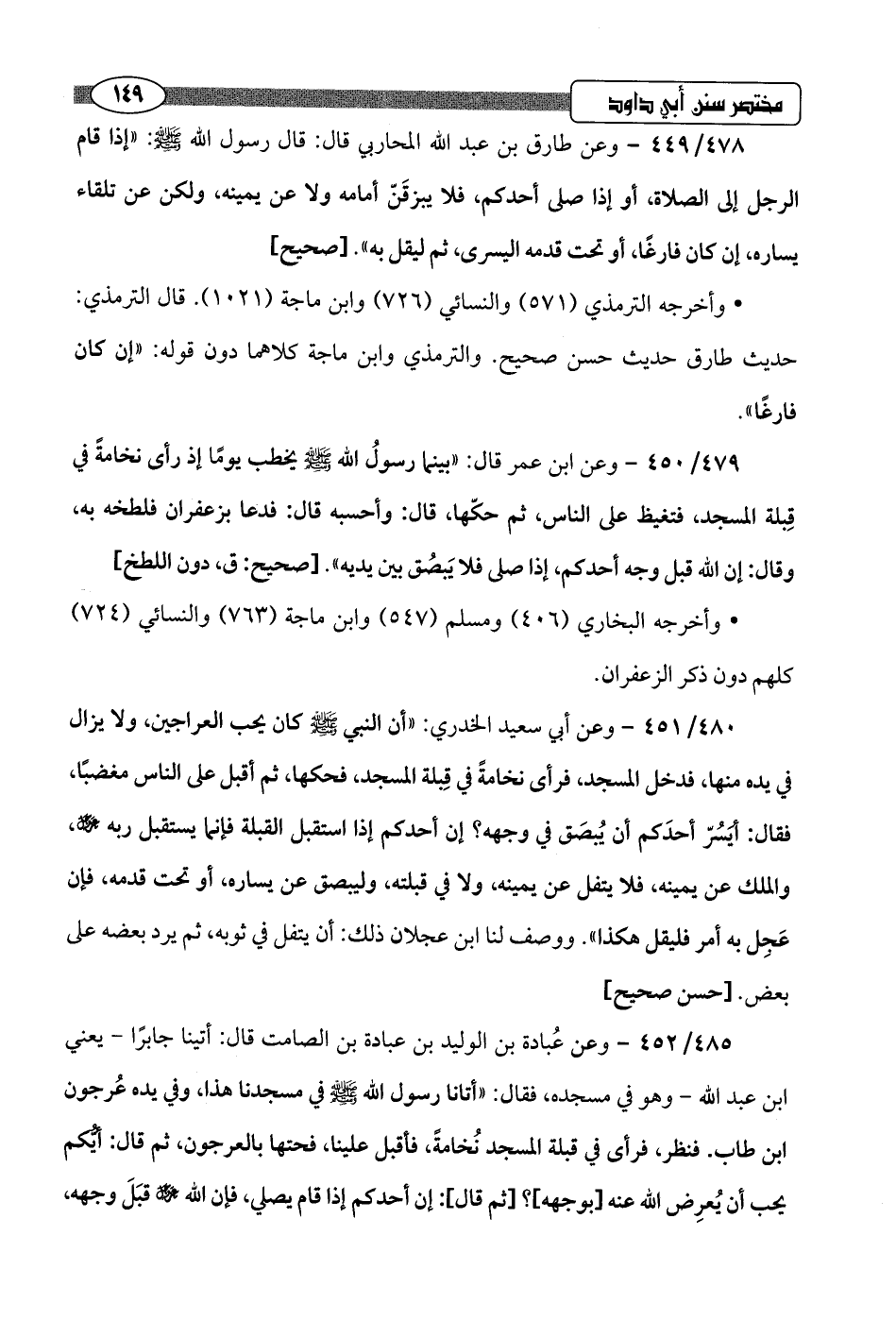 478/ 449 - وعن طارق بن عبد اللَّه المحاربي قال: قال رسول اللَّه -صلى اللَّه عليه وسلم-: "إذا قام الرجل إلى الصلاة، أو إذا صلى أحدكم، فلا يبزقَنّ أمامه ولا عن يمينه، ولكن عن تلقاء يساره، إن كان فارغًا، أو تحت قدمه اليسرى، ثم ليقل به".hصحيح]