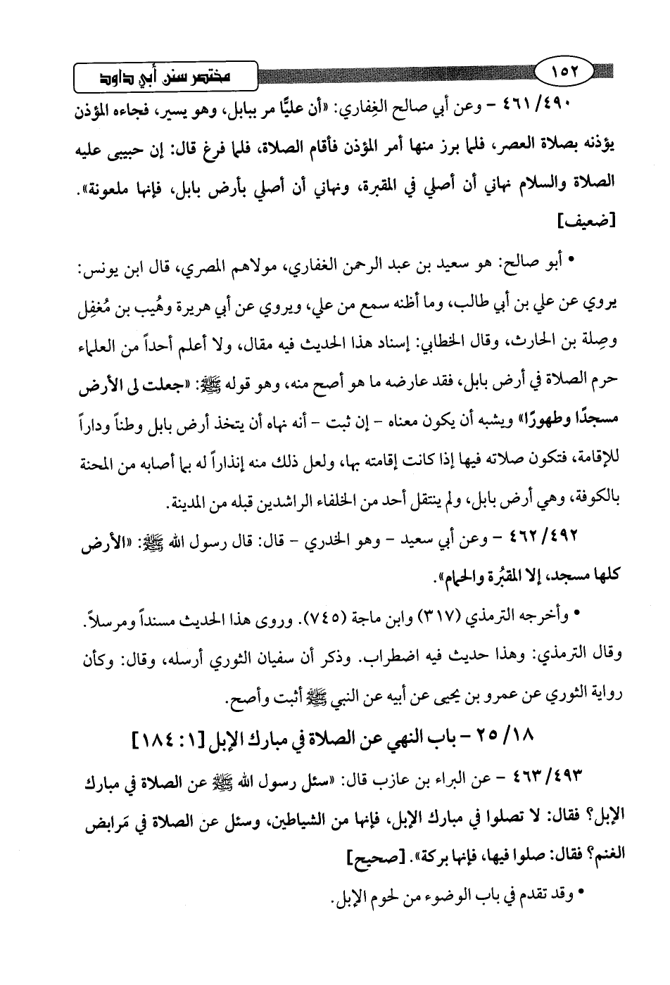 490/ 461 - وعن أبي صالح الغِفاري: "أن عليًّا مر ببابل، وهو يسير، فجاءه المؤذن يؤذنه بصلاة العصر، فلما برز منها أمر المؤذن فأقام الصلاة، فلما فرغ قال: إن حبيبى عليه الصلاة والسلام نهاني أن أصلي في المقبرة، ونهاني أن أصلي بأرض بابل، فإنها ملعونة".hضعيف]