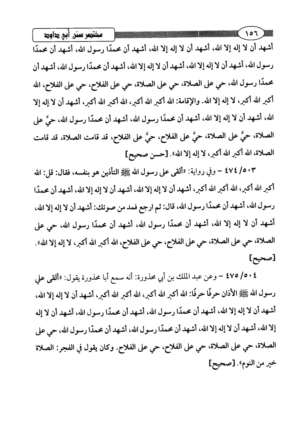 504/ 475 - وعن عبد الملك بن أبي محذورة: أنه سمع أبا محذورة يقول: "ألقى علي رسول اللَّه -صلى اللَّه عليه وسلم- الأذان حرفًا حرفًا: اللَّه أكبر اللَّه أكبر، اللَّه أكبر اللَّه أكبر، أشهد أن لا إله إلا اللَّه، أشهد أن لا إله إلا اللَّه، أشهد أن محمدًا رسول اللَّه، أشهد أن محمدًا رسول اللَّه، أشهد أن لا إله إلا اللَّه، أشهد أن لا إله إلا اللَّه، أشهد أن محمدًا رسول اللَّه، أشهد أن محمدًا رسول اللَّه، حي على الصلاة، حي على الصلاة، حي على الفلاح، حي على الفلاح. وكان يقول في الفجر: الصلاة خير من النوم".hصحيح]